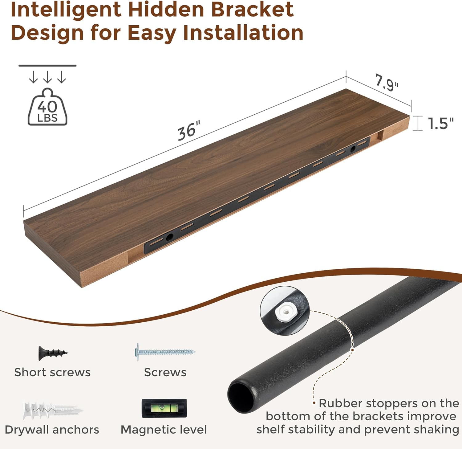 - 【Sturdy Support】Make the most of your wall space with our 36 x 8 inch walnut floating shelves for wall for room wall. At 1.5 inches thick, they offer sturdy support for your plants and decorative pieces. Each shelf can hold up to 30 lbs, ensuring your items never sag or fall.