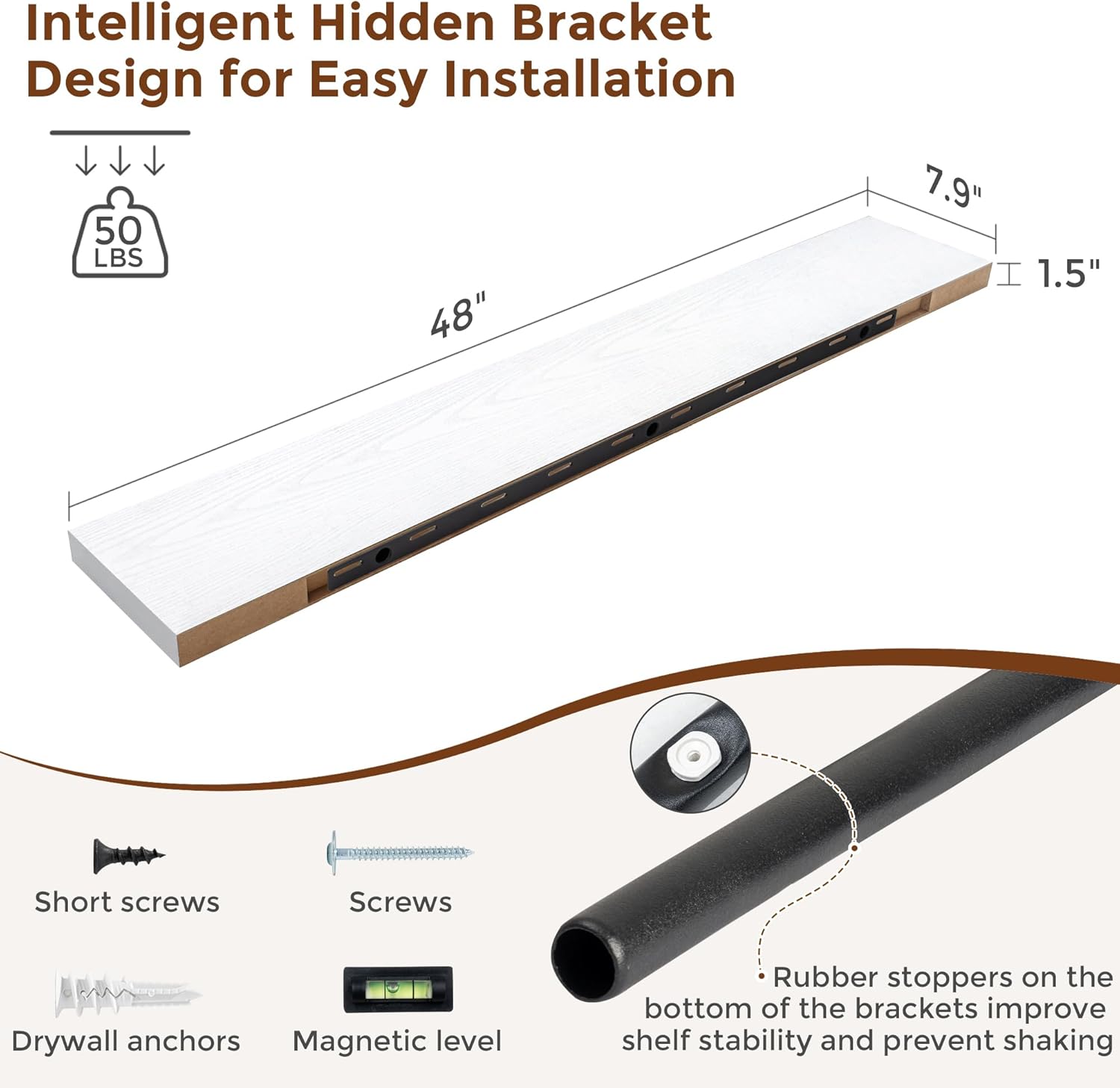 Heimlove 48 Inch Floating Shelves for Wall 8 Inch Deep White Shelves Set of 2,Wall Mounted Rustic Wood Long Floating Shelf,Large Display & Storage Shelf with Invisible Brackets
