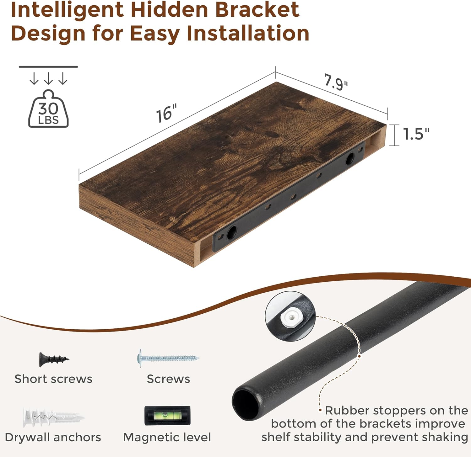 Heimlove 16 Inch Floating Shelves for Wall Rustic Brown Shelves Set of 2,Wall Mounted Rustic Wood 8 Inch Deep Floating Shelf with Invisible Brackets for Bedroom Kitchen Living Room
