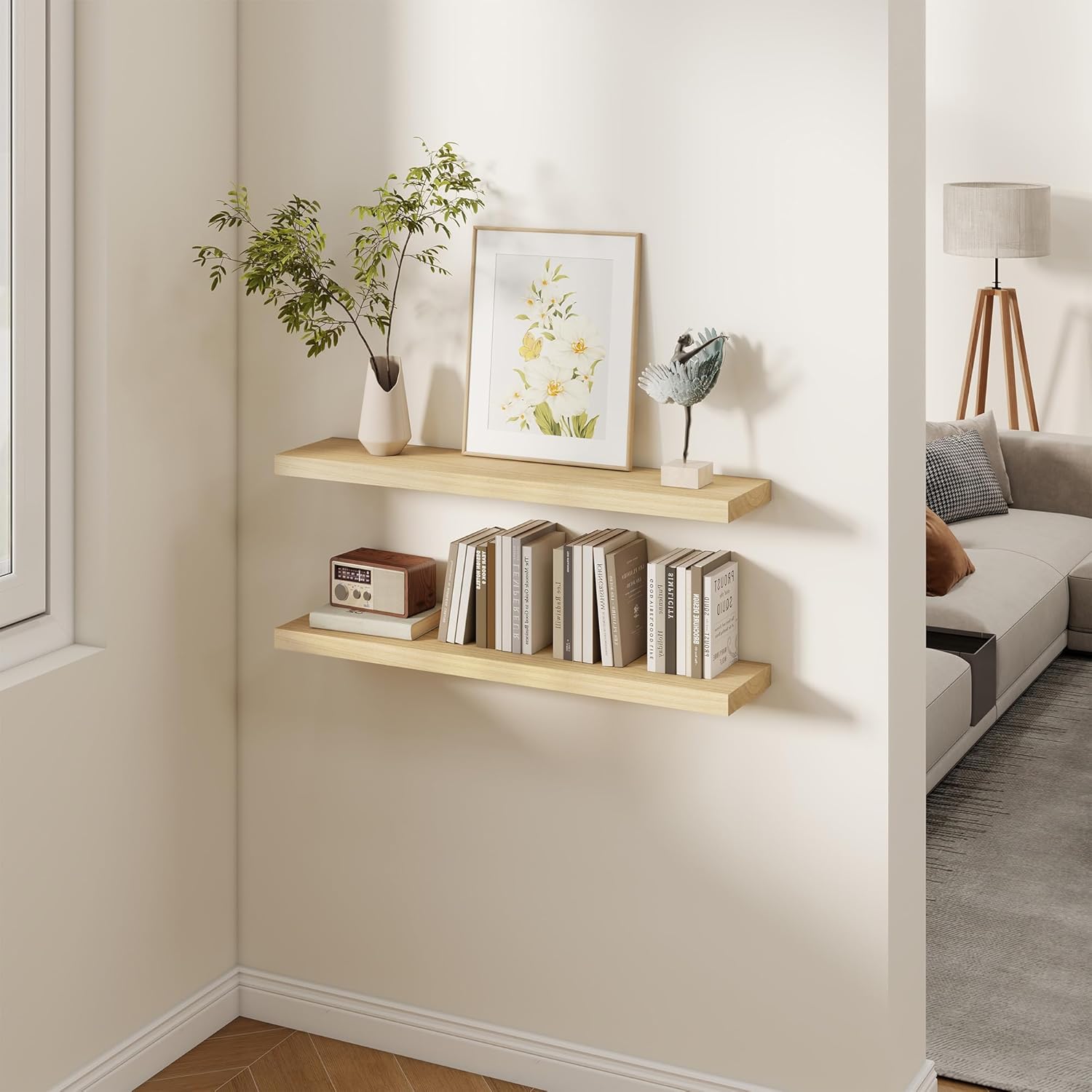 Fun Memories Rustic Real Wood Floating Shelves, 8 Inch Deep Floating Shelf Wall Mounted, 36" W x 8" D Wall Shelves Storage Shelves for Living Room, Bedroom, Bathroom, Burlywood, Set of 2