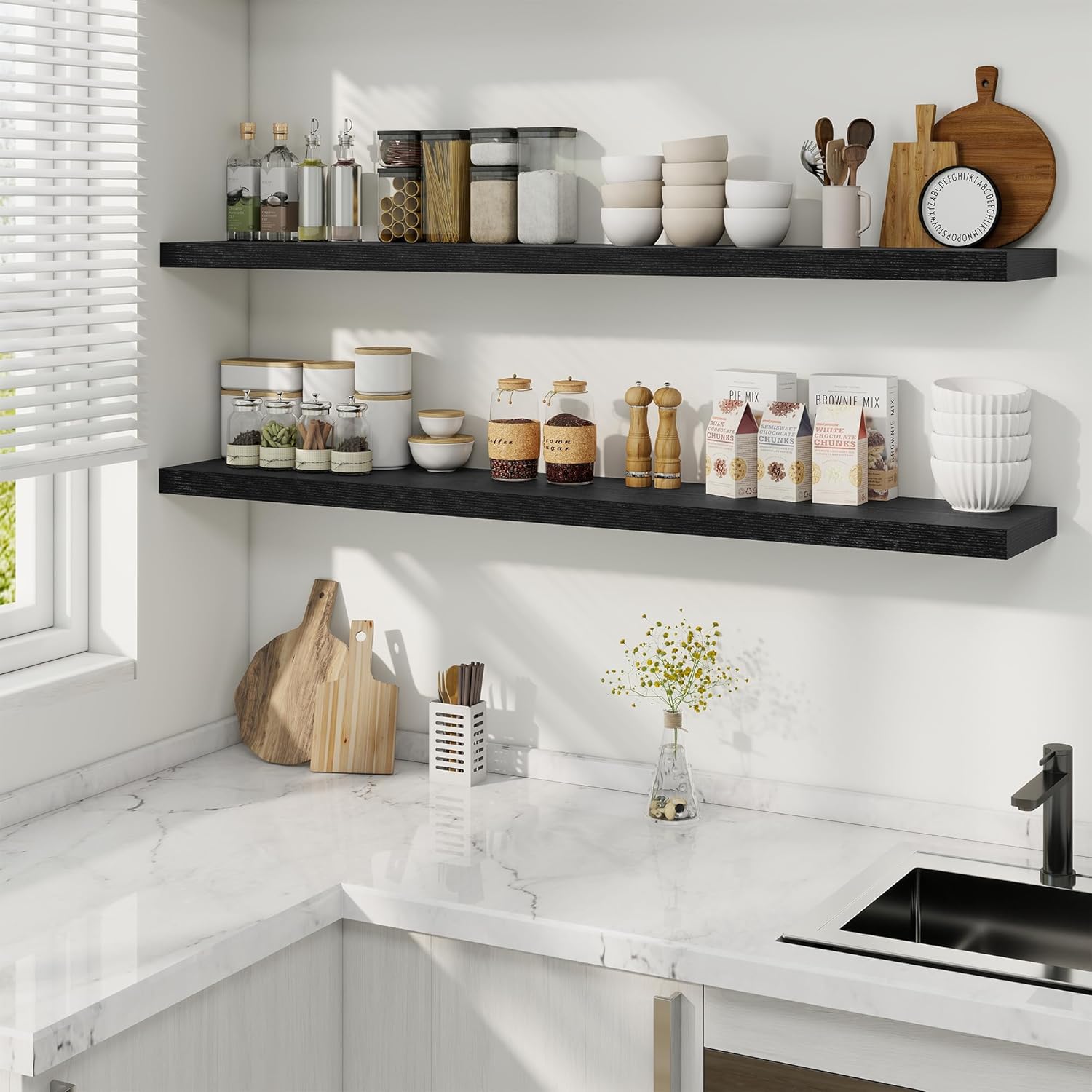 Fun Memories 55 Inch Fireplace Mantel Shelf -Long Floating Shelves, Deep Wall Mounted Farmhouse Display Shelves with Invisible Heavy Duty Metal Bracket, Black, 2 Pack
