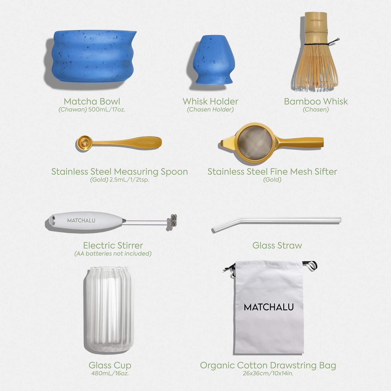 - Complete Matcha Kit: 1* Ceramic Bowl with Spout 500mL/17oz. (Chawan), 1* Bamboo Matcha Whisk (Chasen), 1* Whisk Holder (Chasen Holder), 1* Stainless Steel (Gold) Measuring Spoon 2.5mL/1/2 tsp., 1* Stainless Steel (Gold) Fine Mesh Sifter, 1* Electric Stirrer (not included two AA batteries), 1* Glass Cup 480mL/16oz., 1* Glass Straw, 1* Organic Cotton Drawstring Bag 26x36cm/ 10x14in.