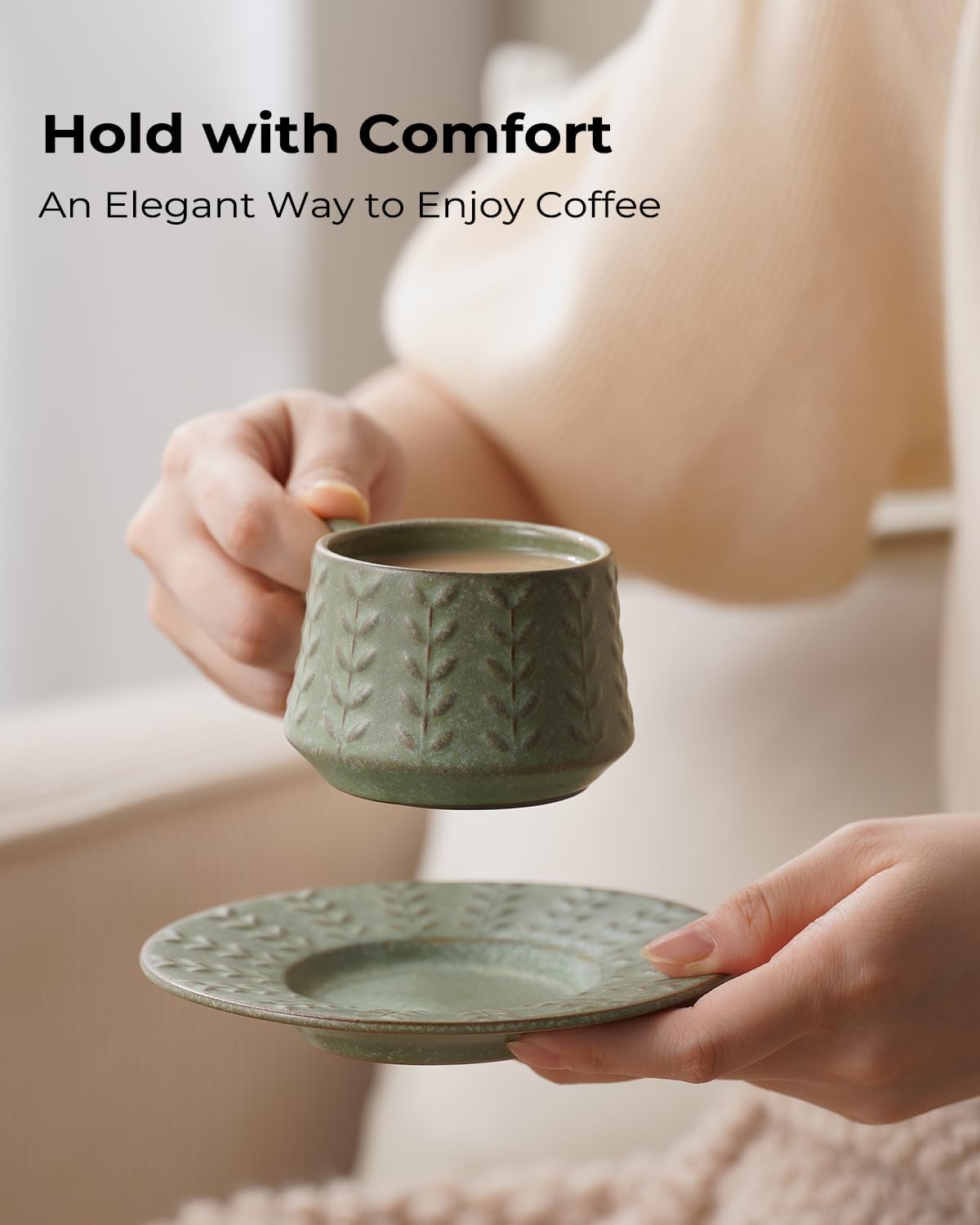 - Perfect Size: Sized at 4 oz, these coffee cups are perfect for espresso or a small cappuccino. Matching saucers double as snack plates, and the cup base fits saucers to stay secure when moved — no worries about slipping, breaking, or coming loose