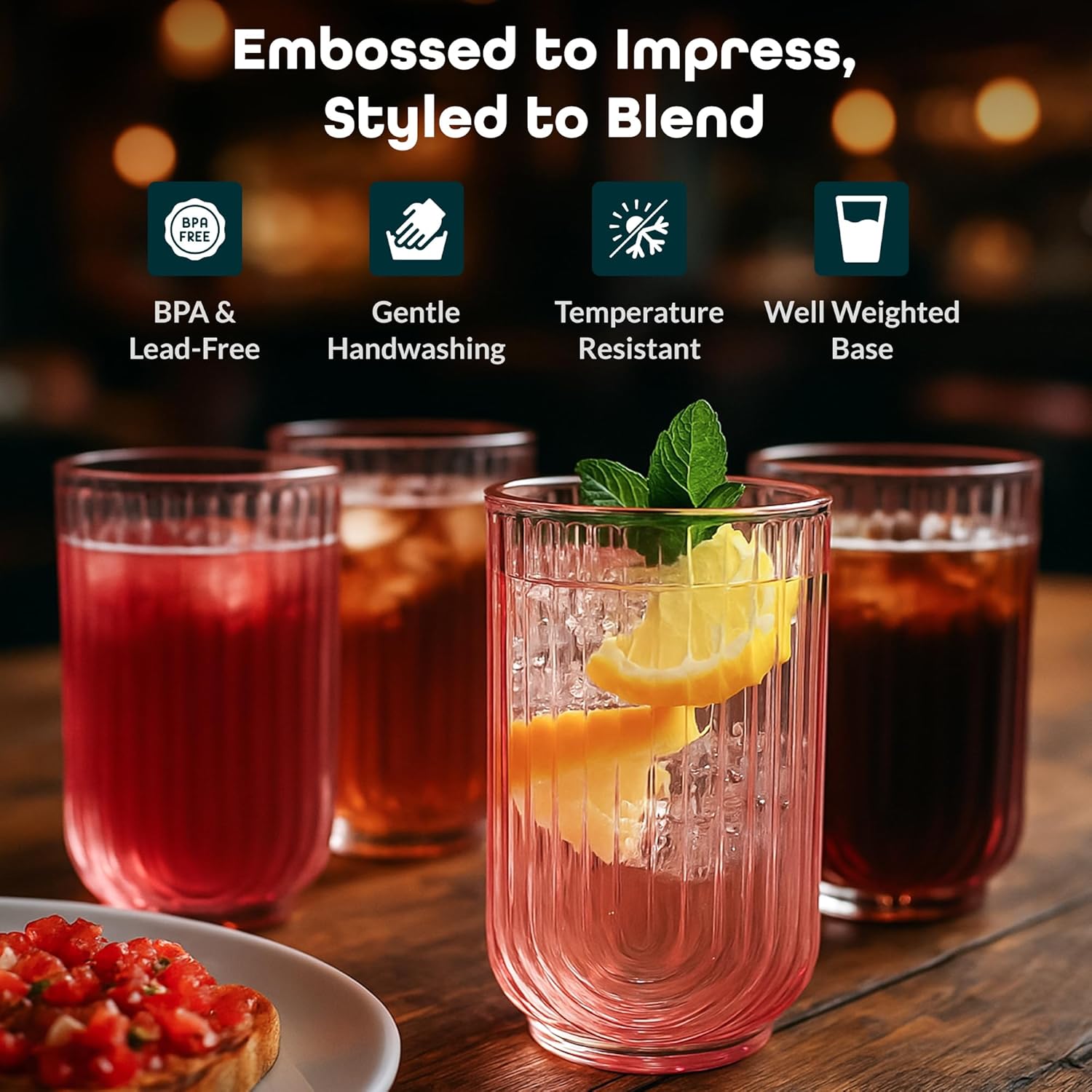 - 🍹ELEGANT DESIGN: Our art deco-inspired pink glass tumblers feature a distinctive arch pattern that adds sophistication to any table setting. These colored drinking glasses are perfect for a variety of drinks, including juice, iced tea, iced coffee, smoothies, cocktails, beer, and everyday beverages. They work for both casual dinners and elegant parties, making them a perfect addition to your vintage or modern drinkware collection.