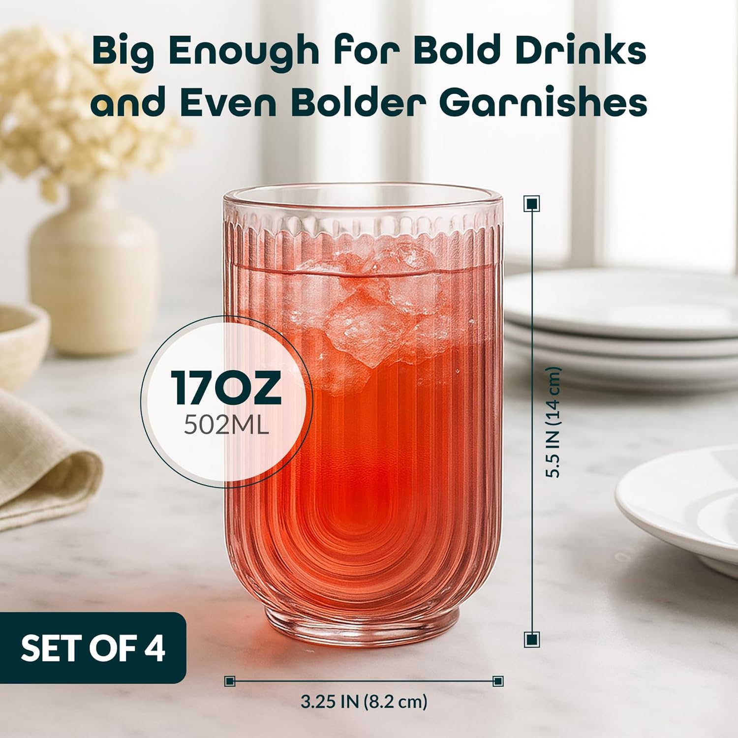 Glaver's Vintage Glassware Art Deco Highball Glasses Set of 4 Blush Ribbed Drinking Glasses 17 Oz U-Shape Arch Design Colored Cocktail Kitchen Tumblers Everyday Dinner Decorative Party, Pink