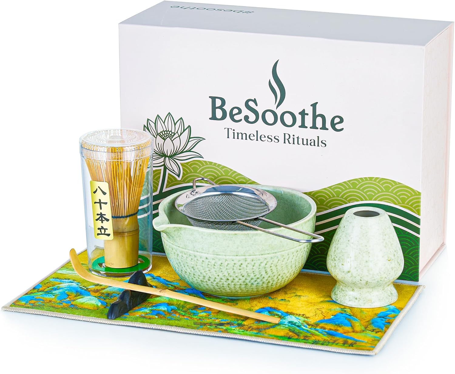 BeSoothe Matcha Whisk Set - Premium Matcha Set 7 Pcs - Ceremony Matcha Powder Kit - Matcha Tea Set for Making Latte - Matcha Whisk Set and Bowl with Scoop&Sifter, Ceramic Bowl - Gift for Matcha Lovers