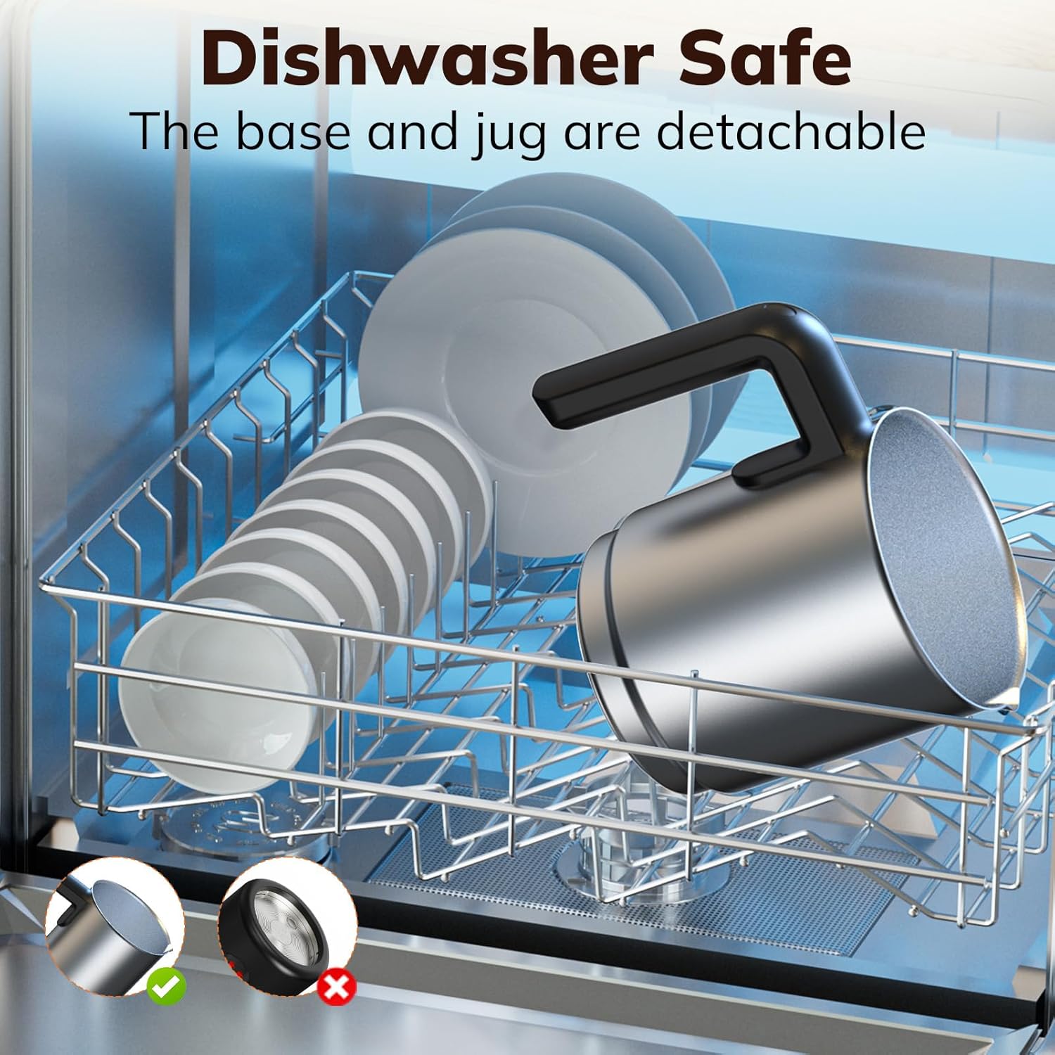 - Our electric milk frother features a split design, making cleaning a breeze. Unlike many non-detachable milk frother, ours is dishwasher safe for added convenience. To ensure optimal performance, please wipe off water stains from the base of the milk jug after each cleaning.