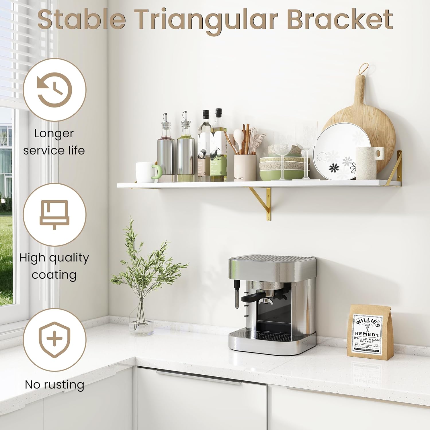 Floating Shelves for Wall, 12 Inch Deep Floating Shelves Set of 2, 48W x 12D Large Wall Shelf with Sturdy Metal Brackets for Living Room, Bathroom, Bedroom and Kitchen, White with Gold Bracket