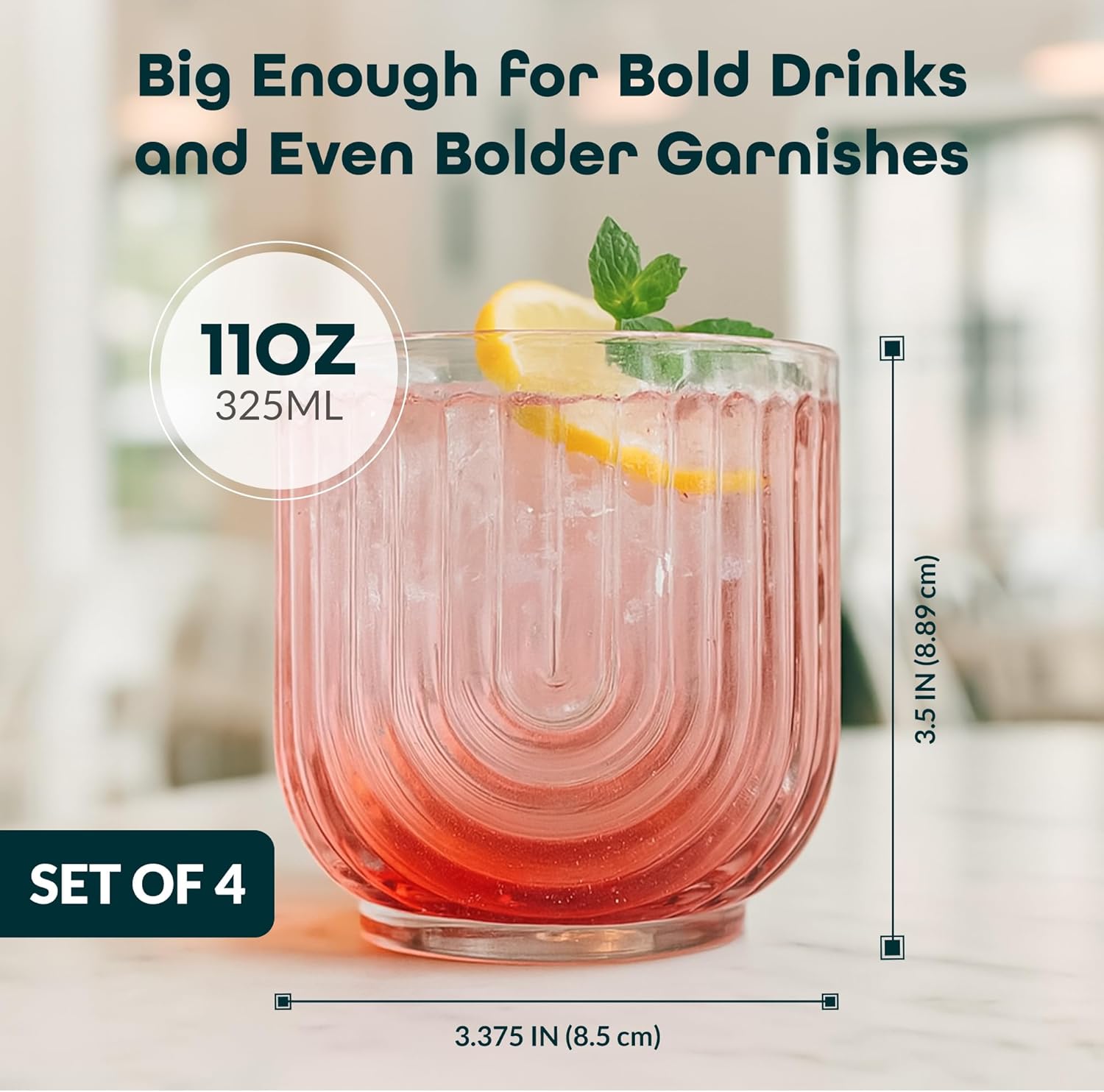 - 💖ELEGANT DESIGN: Art Deco U-shaped pattern in pink glass creates a stunning vintage-inspired look perfect for any home bar or dining setting. These blush pink double old-fashioned whiskey glasses are perfect for a variety of alcohol beverages including spirits neat or on the rocks, cocktails, bourbon, scotch or any other soft cold drink like water and juice.