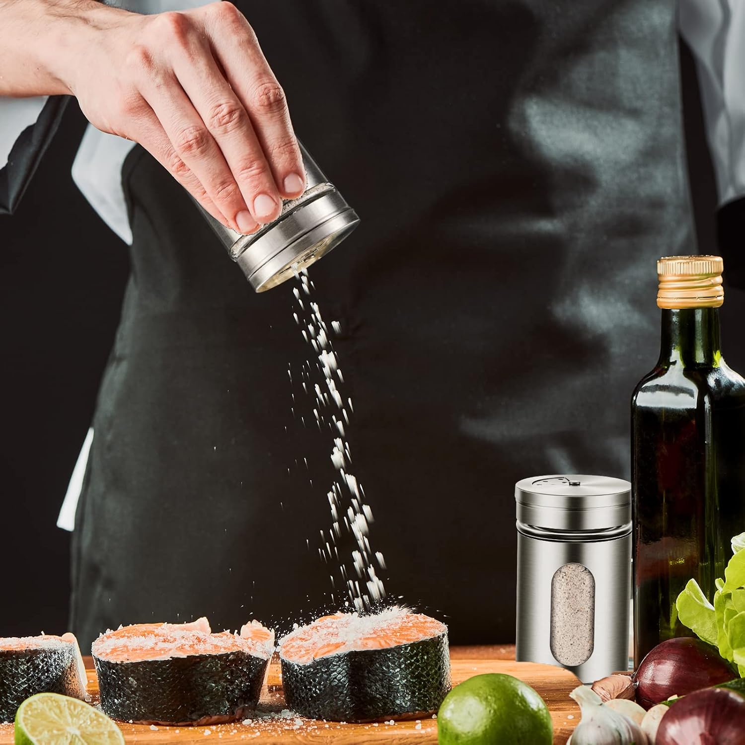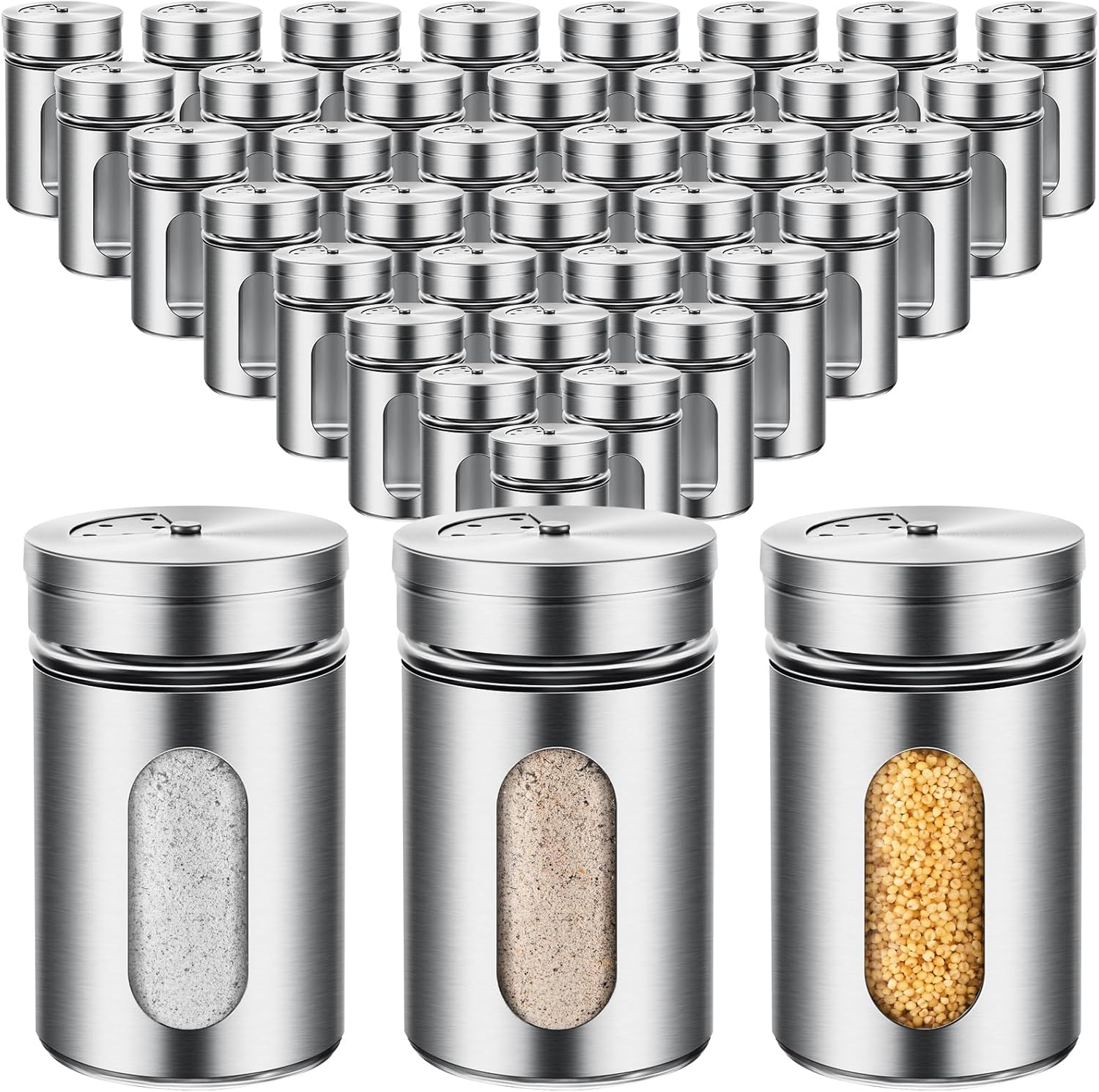 Dandat 36 Pcs Salt and Pepper Shakers Stainless Steel Spice Shakers with Adjustable Pour Holes and Glass Window 3.4oz Salt Dispenser Spice Jars with Rotating Lids for Sugar Seasoning Home
