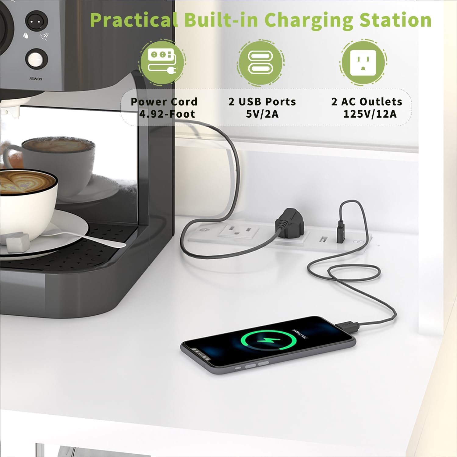 - Practical Charging Station: Our bar cabinet has been designed with all the appliances of modern life in mind and is equipped with 2 practical power outlets and 2 USB ports. Whether it's a coffee maker, juicer, toaster or your mobile phone and other electronic devices that are always close at hand, they can all be charged here. No need to worry about finding an extra power strip. With a 4.92-foot cable, it's easy to connect to power wherever you place your cabinet.