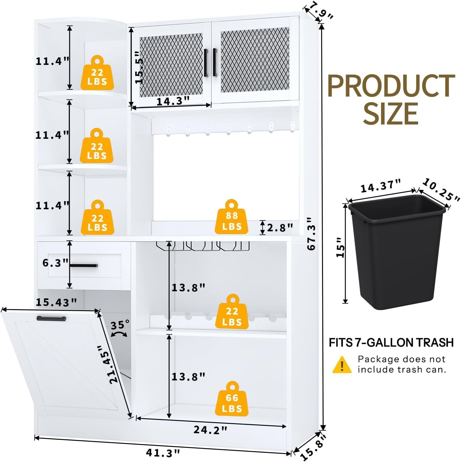 - Ample Storage Space: Our Kitchen Pantry Storage Cabinet is equipped with a spacious tabletop that can be used not only to hold your favourite coffee maker, bartender, but also as a temporary operating platform. Smooth drawers, 5 open shelves, and a mesh door cabinet are staggered to provide a platform for displaying your carefully selected decorative items, your wine collection, and a wide range of beautiful accessories. The specially designed wine rack and hooks, designed with practicality in mind, can easily hold 6 bottles of wine, as well as 6 inverted glasses and 7 mugs, and there is a tilt out trash can cabinet for easy access.