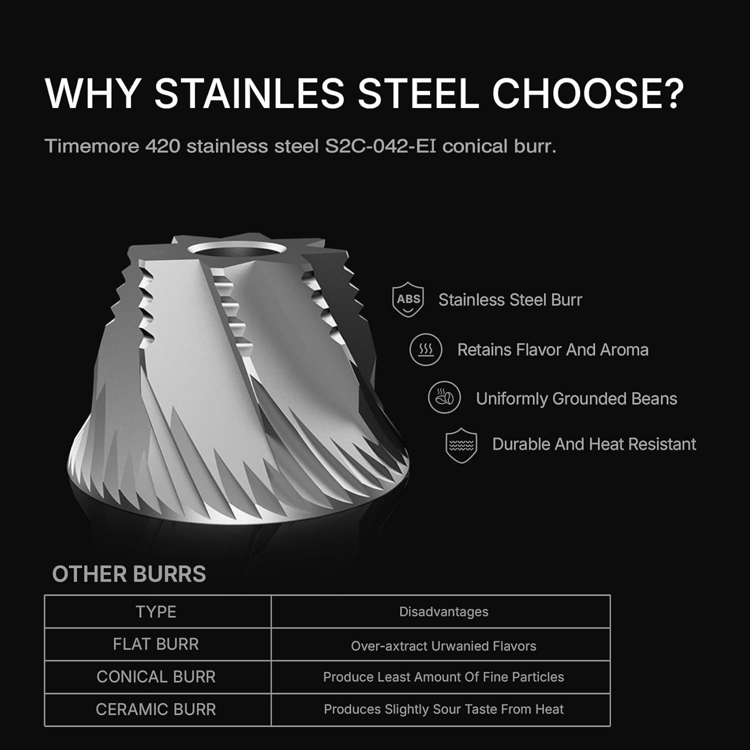 - [ Patented Burrs & 30 Precision Grind Settings ] Featuring TIMEMORE patented S2C-420-EI stainless steel octagonal burrs, The Whirly grinder is theperfect choice for those who love theclassic espresso flavor profile but alsoenjoy the occasional filter coffee. Thisburr set delivers elevated sweetness andricher crema while reducing the difficultyof pressure building during extraction,making it ideal for achieving a perfectlybalanced shot. We found that it doesespecially well with medium to dark roastsemphasizing round, integrated flavors.