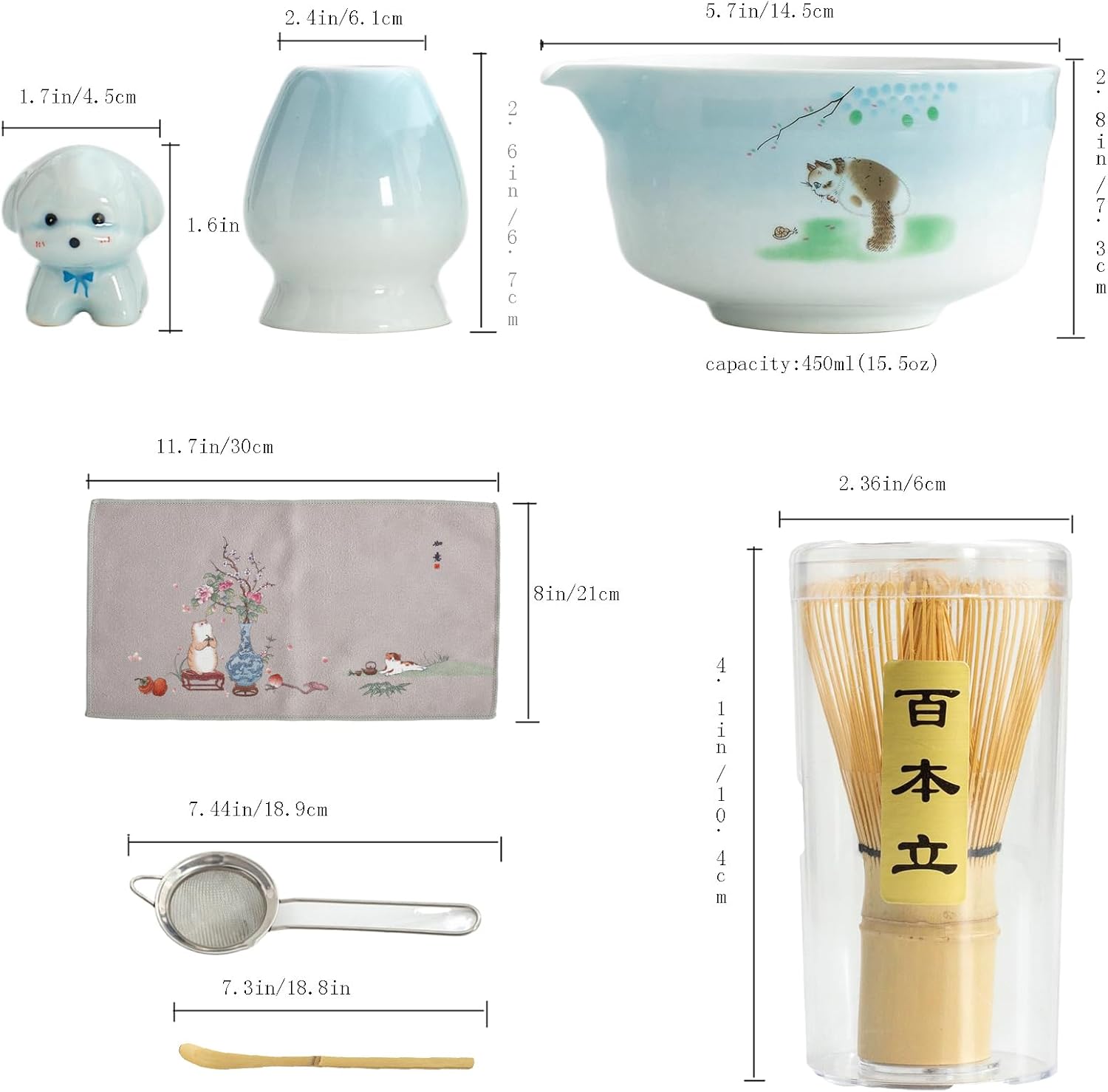 - 1: 7-piece matcha whiskey set: 1 520ml/19oz ceramic bowl, 1 bamboo whiskey, 1 bamboo spoon, 1 Cermaic whiskey holder, 1 ceramic spoon holder, 1 cotton tea cloth, 1 matcha powder sifter. All accessories are included, perfect gift for matcha lovers.