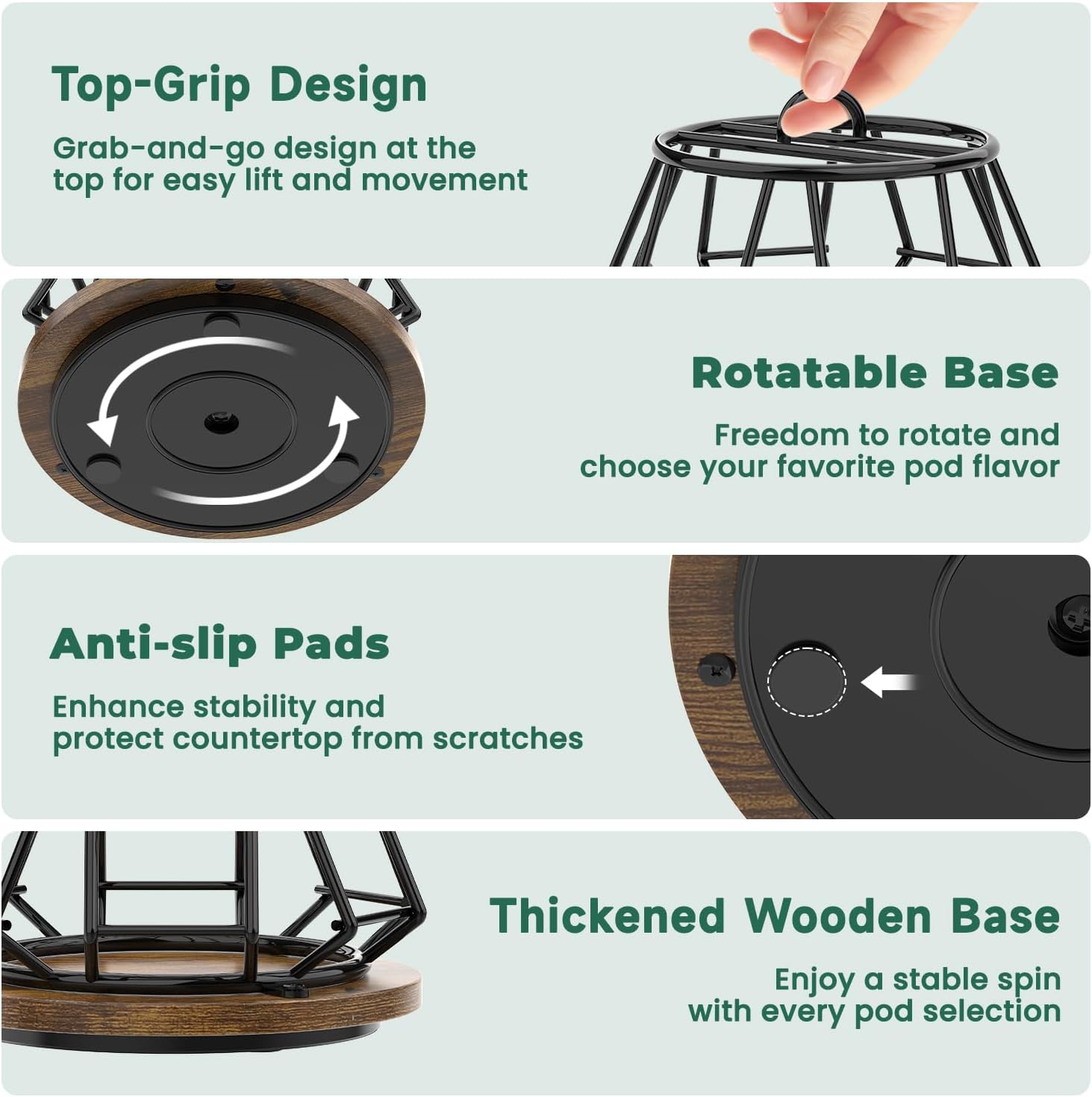 - Stable & Durable Structure: Built with premium metal and a reinforced wood base, this coffee pod holder ensures long-term durability. No more wobbling or tipping—just reliable support for your coffee corner, day after day