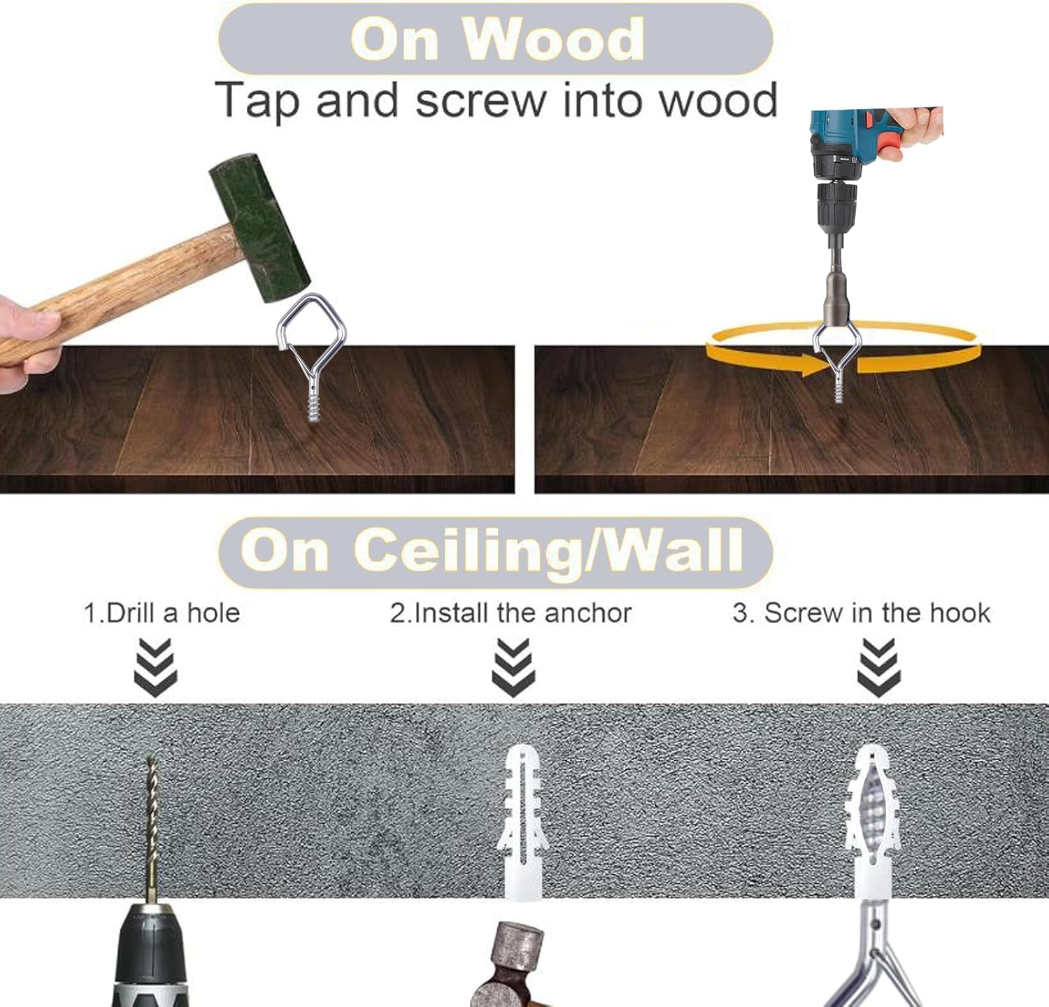 - 🔧【Easy Screw-In Installation】 Simply twist into wood, ceilings, beams, fences, or walls for instant hanging support. 2.36-inch length provides a firm hold.