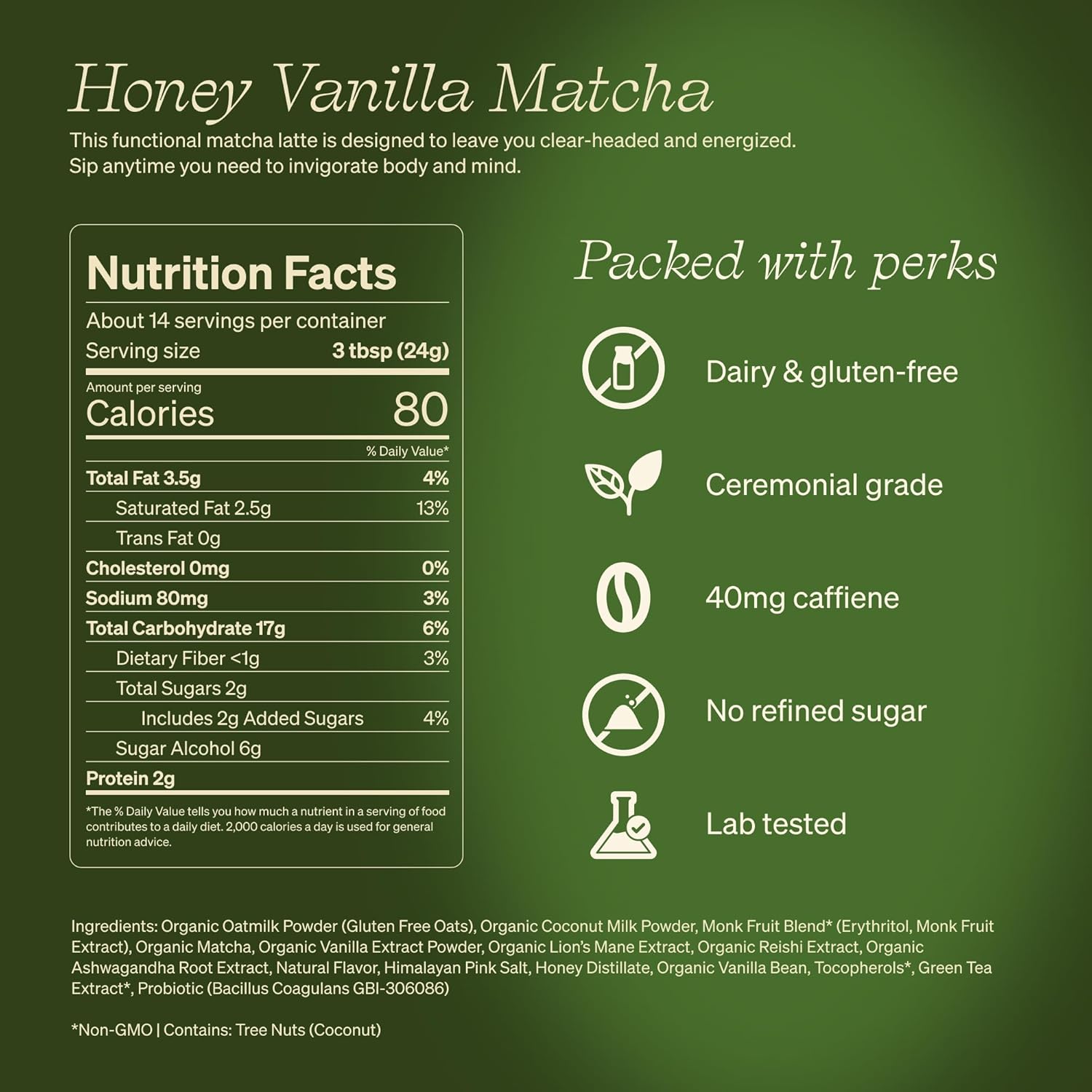Clevr Blends Organic Honey Vanilla Matcha SuperLatte, Instant Ceremonial Grade, Superfood Powder Blend, Oat Milk, Lions Mane, Reishi Mushroom, Coconut Cream, Ashwagandha, Serve Hot or Iced (14 Lattes)