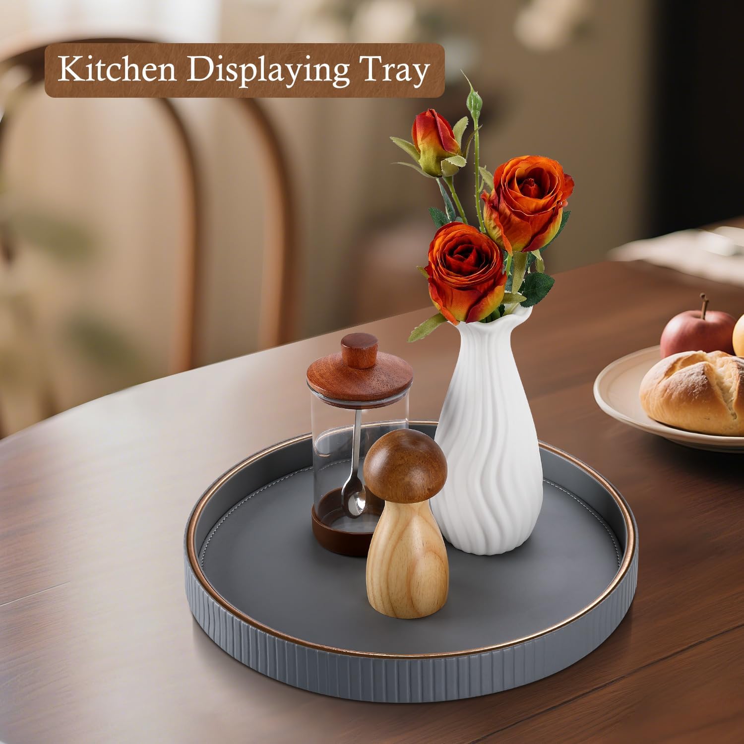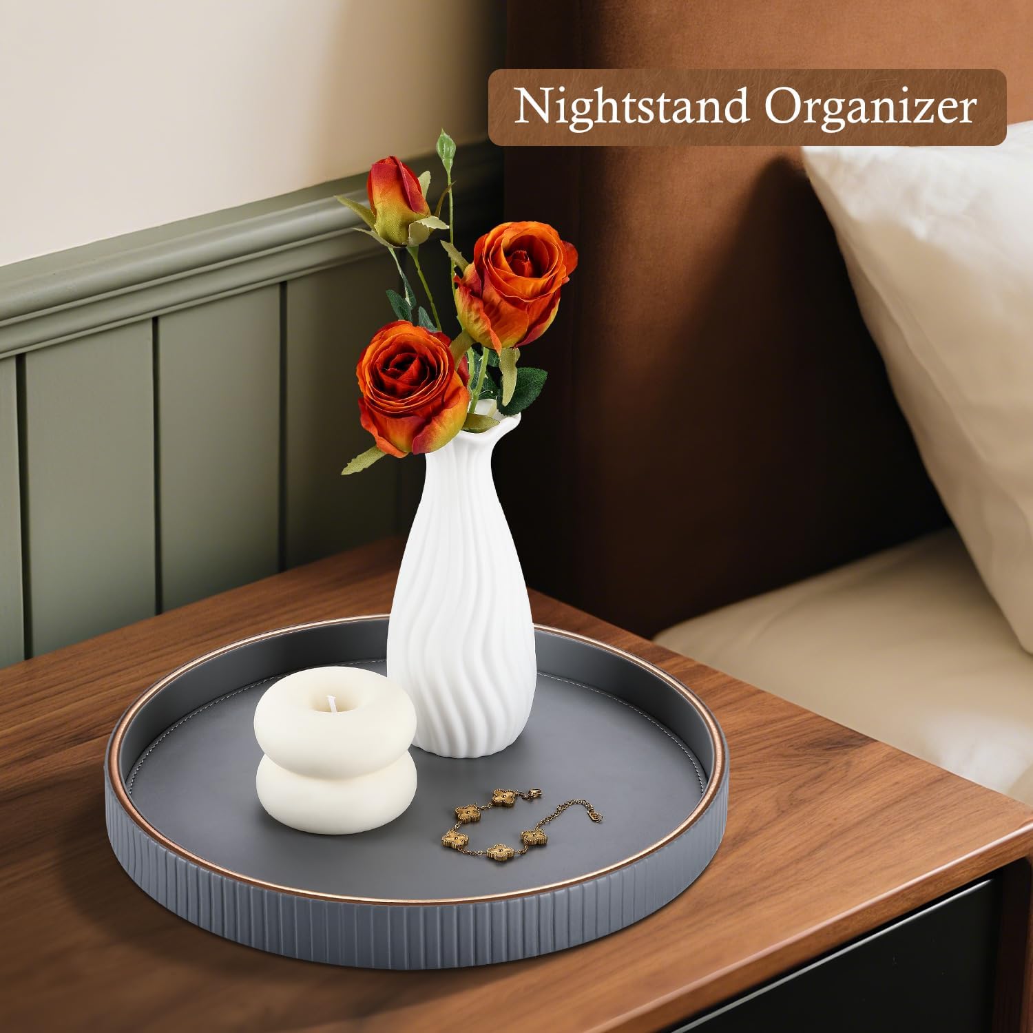 GORESE Round Coffee Table Tray for Home Decor, 12" PU Leather Decorative Serving Trays Table Centerpiece for Kitchen Island, Perfume Trinket Trays for Dresser, Ottoman Tray Nightstand Organizer, Gray