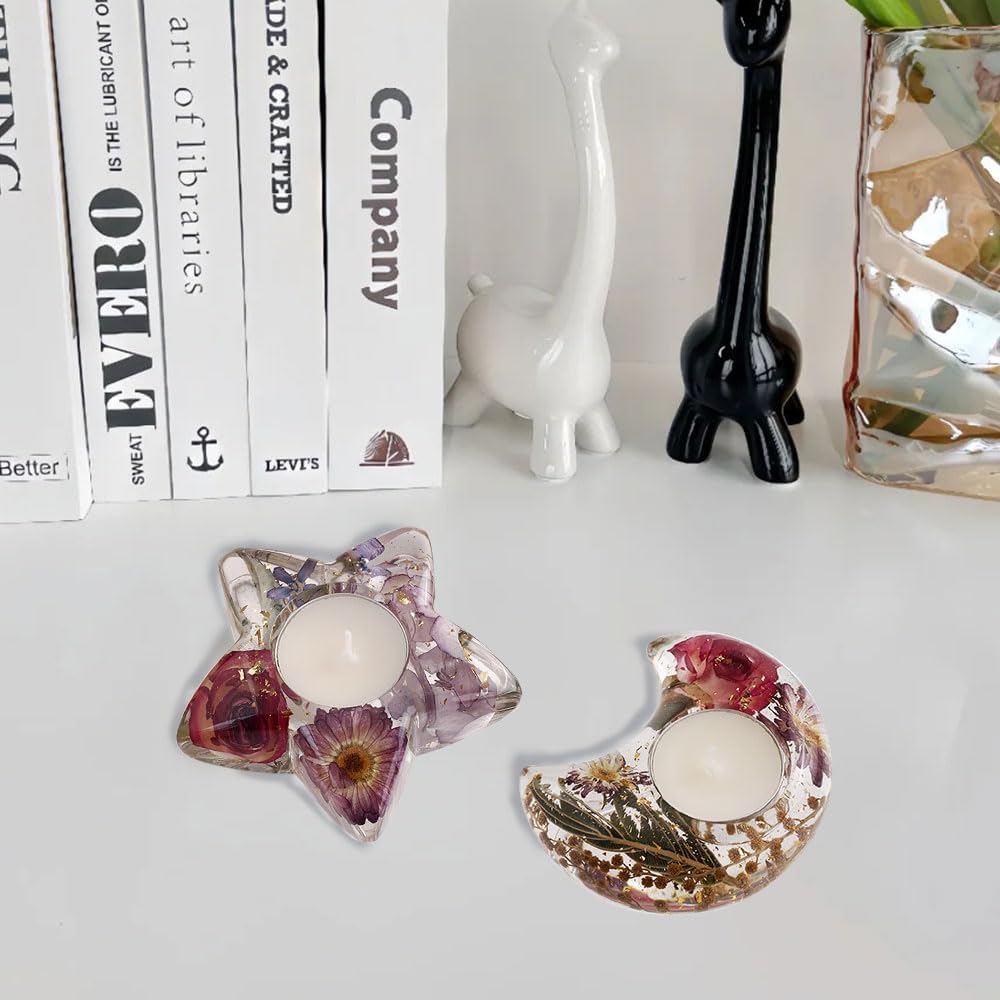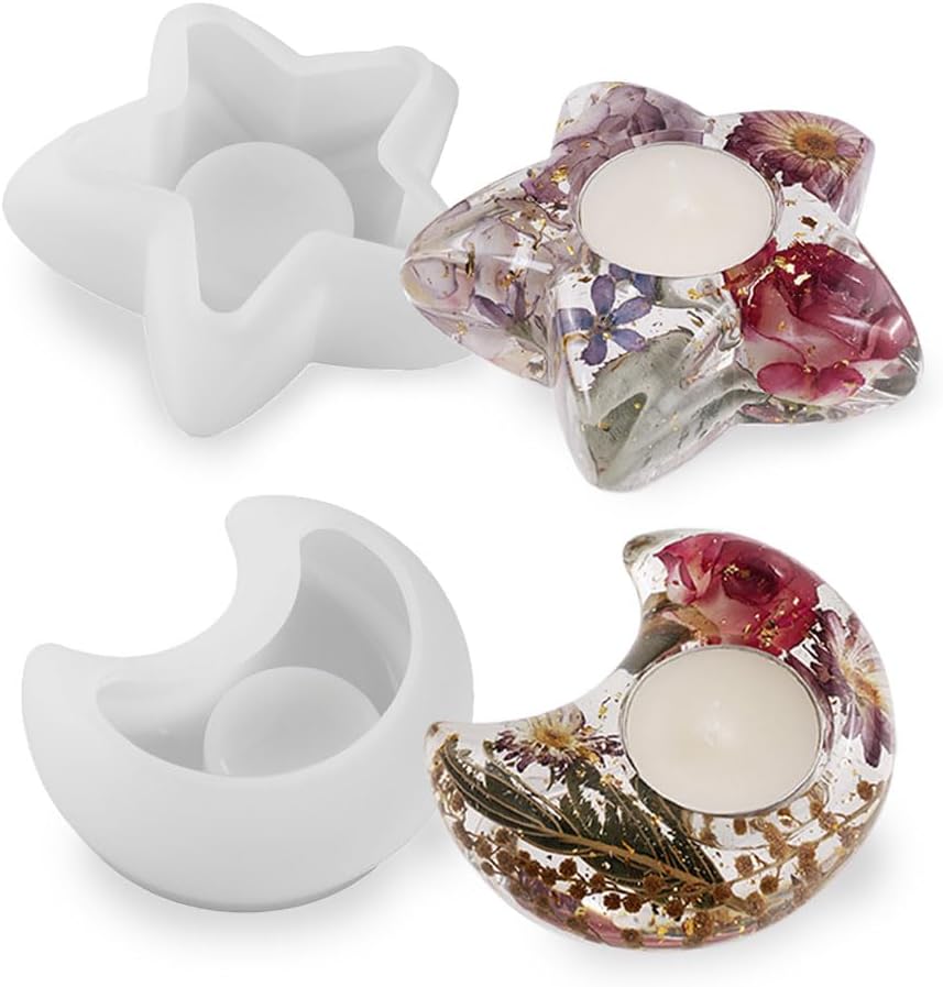 - Package includes: 1 pcs star shape candle holder molds for epoxy resin, size:4*4*1.57 inch,and 1 pcs moon shape tealight candle holder resin molds,size:3.8*3.3*1 inch.