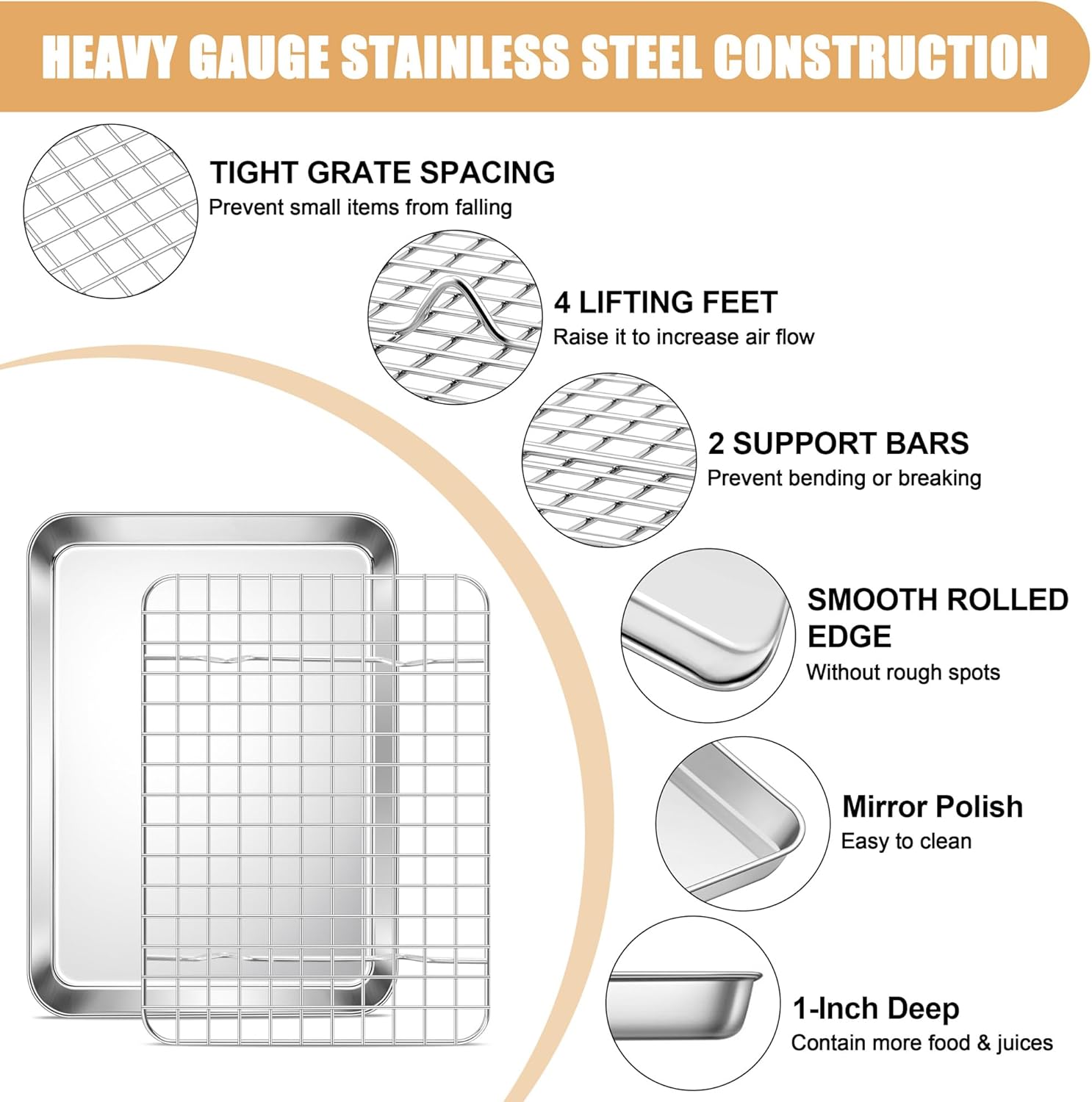 - HEALTHY MATERIAL: E-far baking sheet with rack set is made of pure stainless steel without toxin coating, No harmful substances are generated in the high-temperature baking process, No rusty and deformation resistance, Making the baked food safer, Healthier alternative to aluminum pan and racks