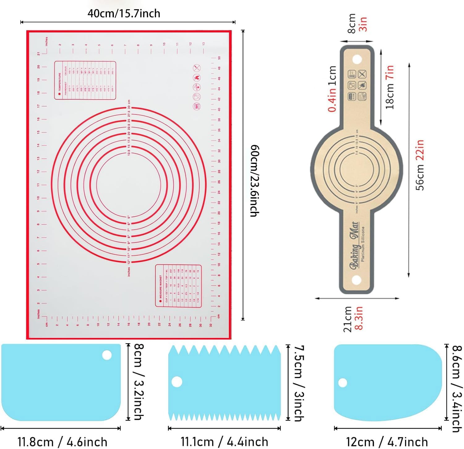 - Multifunctional baking mat: Extra large size 40x60cm (19.7x27.6 inches), large enough for making pizza, cookies and pie dough. And it is easy to store, just roll it up, taking up little drawer space, it won't take up space in the kitchen, helping to reduce mess and cleanup.Simple and convenient conversion chart,The surface of the pastry mat comes with a measuring ruler, and the circular guide makes rolling pie dough or pizza peel a breeze. With both imperial and metric measurements for perfect results!