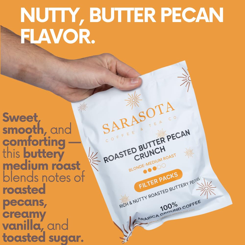 Ground Flavored Coffee In Filter Packs | Medium Roast Low Acid Mold Free Pouches | Sampler Packets | Roasted Butter Pecan Crunch Gourmet Powder Bags for 10-12 Cup Drip Maker | Highest Rated Individual Premeasured Coffee