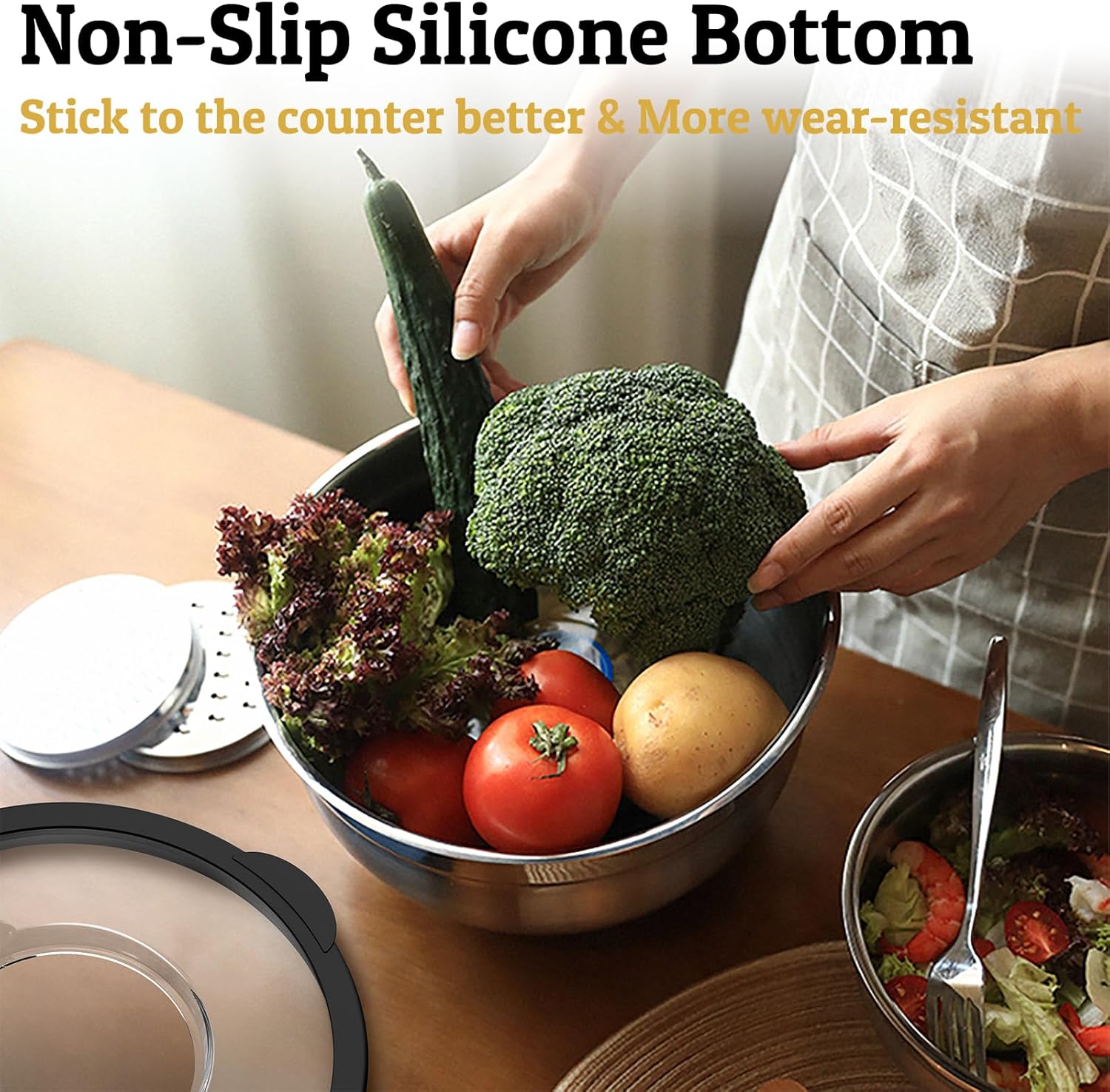 - Thicker Stainless Steel: Effortless Clean & Lasting Shine: Experience kitchen freedom with our stainless bowls! Precision-engineered at 0.46mm for perfect balance - lightweight enough for daily use. Matte-finish exterior ensuring dent resistance and rustproof, The mirror-smooth inside SHEDS sticky batters/oils instantly - just rinse or toss in home dishwashers (<140°F safe). Stackable to save 50% cabinet space. The elegant look and practical accessory composition are the best choice for new home GIFT, Thanksgiving GIFT!