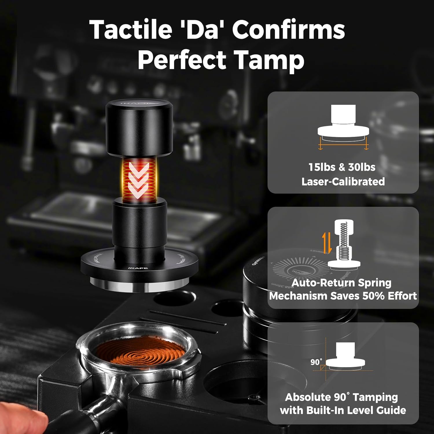 - Audible Click & Auto-Return: Experience true impact tamping! Hear the satisfying "CLICK" confirming exact target pressure is reached. Simultaneously, the auto-return mechanism instantly releases, saving significant effort and time and extraction efficiency. Precision meets efficiency in every tamp