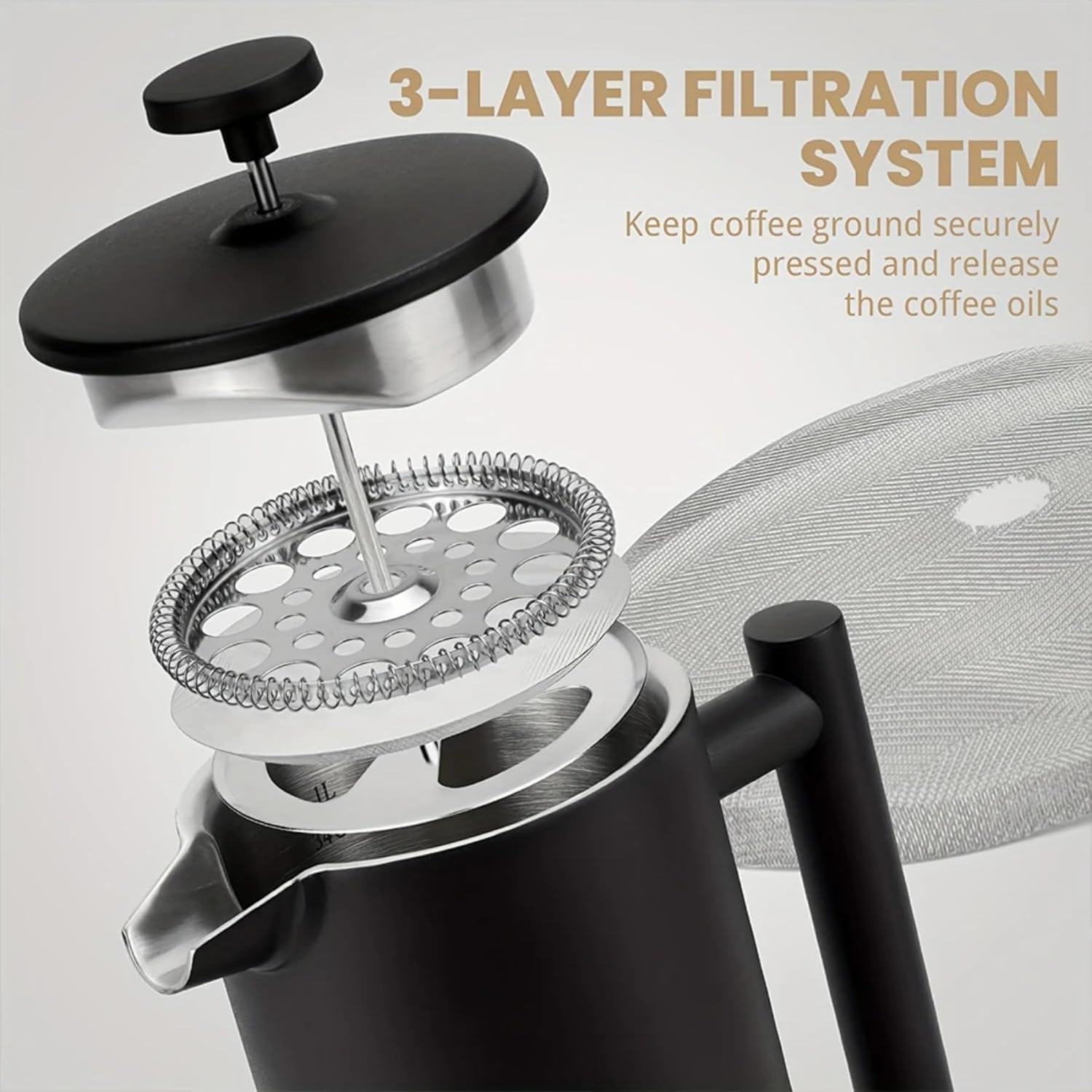 - 3-LAYERED FILTRATION SYSTEM - The french press with a three layered filter structure to stop the sediment, The high quality filtration system of our steel French press traps the smallest coffee grounds to produce a wholesome cup of coffee, giving you an enriching experience.