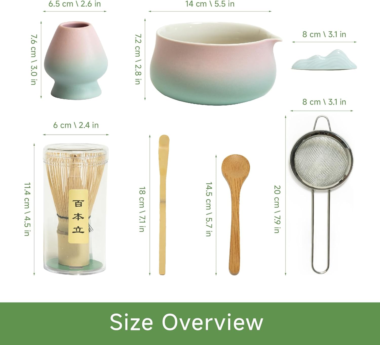 - 6 Elegant colored premium matcha bowls- The matcha bowl (chawan) features an ergonomic spout design for easy pouring. Each matcha cup is hand drawn, made of durable ceramics and fired at a high temperature of 1250 degrees Celsius. The glaze is smooth, safe, and environmentally friendly. Choose from cherry blossom pink, white orange, white blue, white powder gradient, or distant mountain green or black. Enhance your matcha station with fashion.