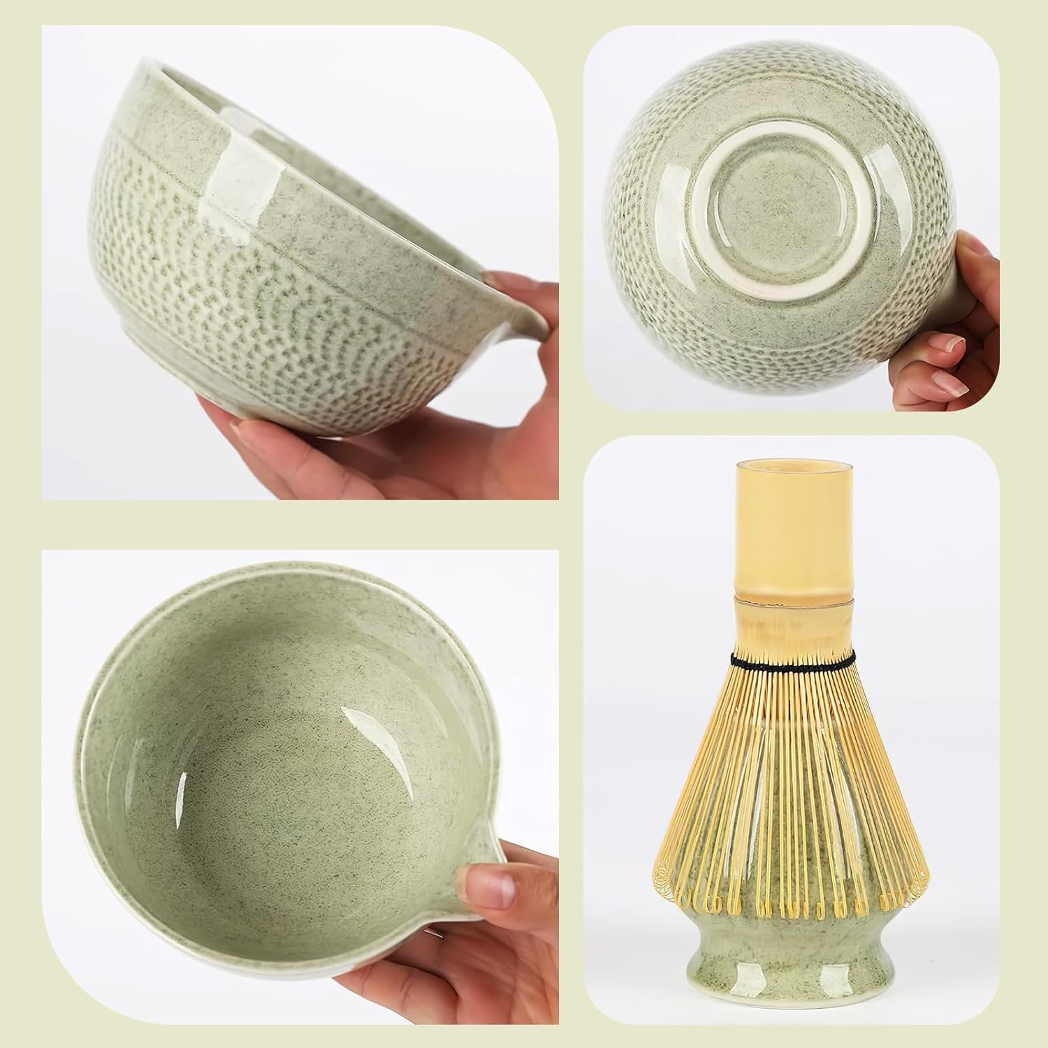 Matcha Whisk Set, Ceramic Matcha Set, Matcha Bowl with Spout, Matcha Whisk & Holder, Sifter and Bamboo Scoop, 5 Pcs Matcha Kit, Matcha Tea Ceremony Gifts for Matcha Lovers & Starter (Matcha Green)