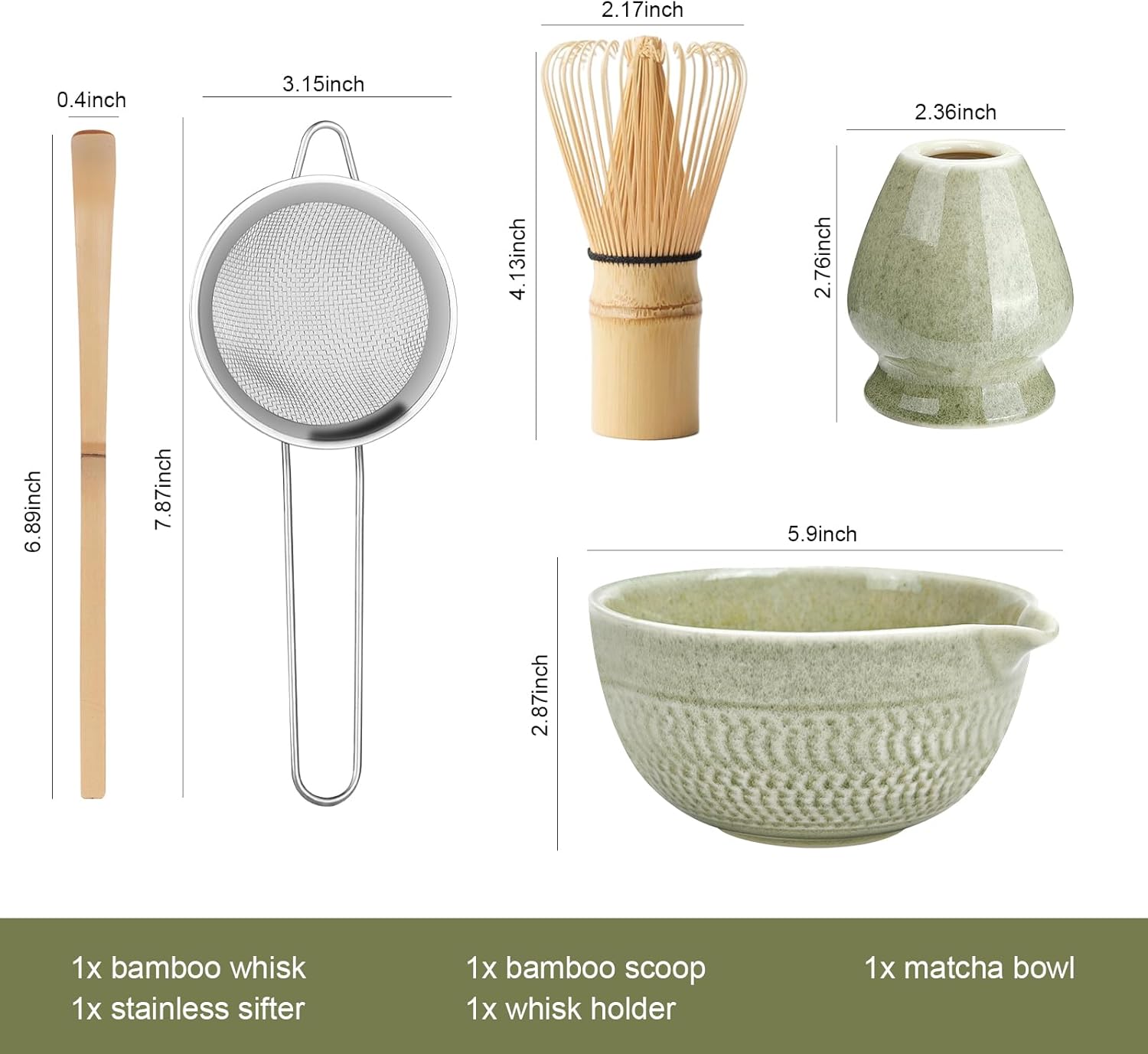 - Matcha Set: Our matcha whisk set meets all your needs for making matcha, including a ceramic matcha bowl, a bamboo matcha whisk, a stainless steel sifter, a bamboo scoop, and a matcha whisk holder. Each accessory is meticulously designed and crafted, perfectly blending traditional and modern styles, allowing you to experience a relaxed and fashionable matcha lifestyle.