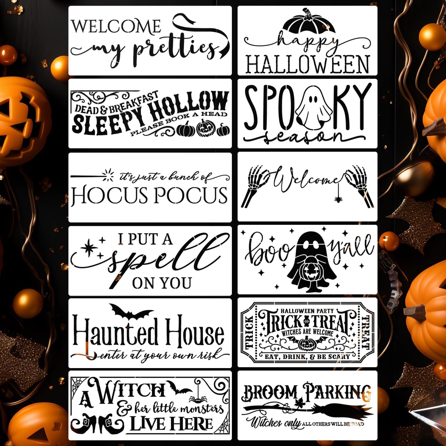 - Halloween Stencils:Decorate doormats, fabrics and porch sign with our Halloween stencils.12 patterns including haunted house,spooky season,happy Halloween,trick or treat,boo y’all and hocus pocus,etc to meet your crafts needs.