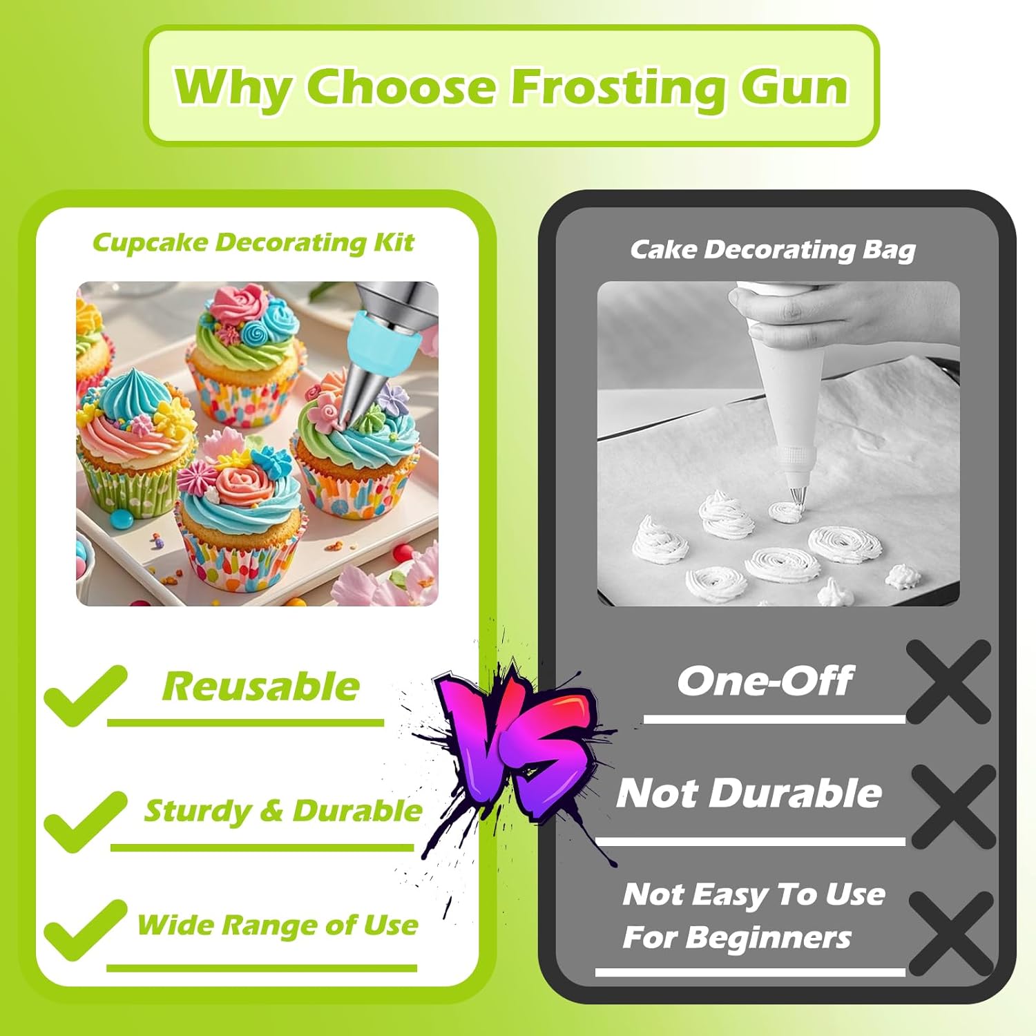 - Cupcake Decorating Kit:You will get a icing gun, 54 replaceable piping tips, which 2 piping tip couplers, 9 silicone baking cups; This icing piping kit can meet your cupcake, cake, pastries, and cookie decoration needs