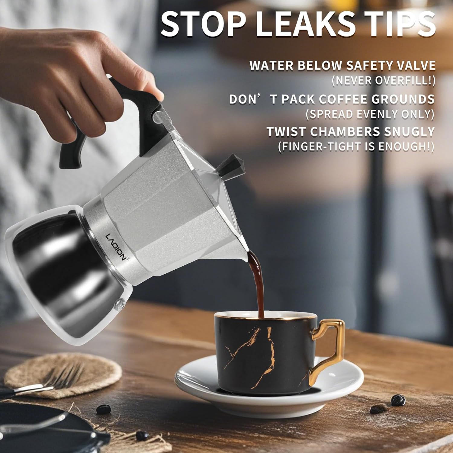- 【A Timeless Classic, Reimagined】Elevate your daily coffee ritual with the LAOION Stovetop Espresso Maker. Crafted from premium aluminum top and stainless steel bottom, this elegant coffee pot is built to last. Its sleek design and sturdy construction make it a stylish addition to any kitchen.