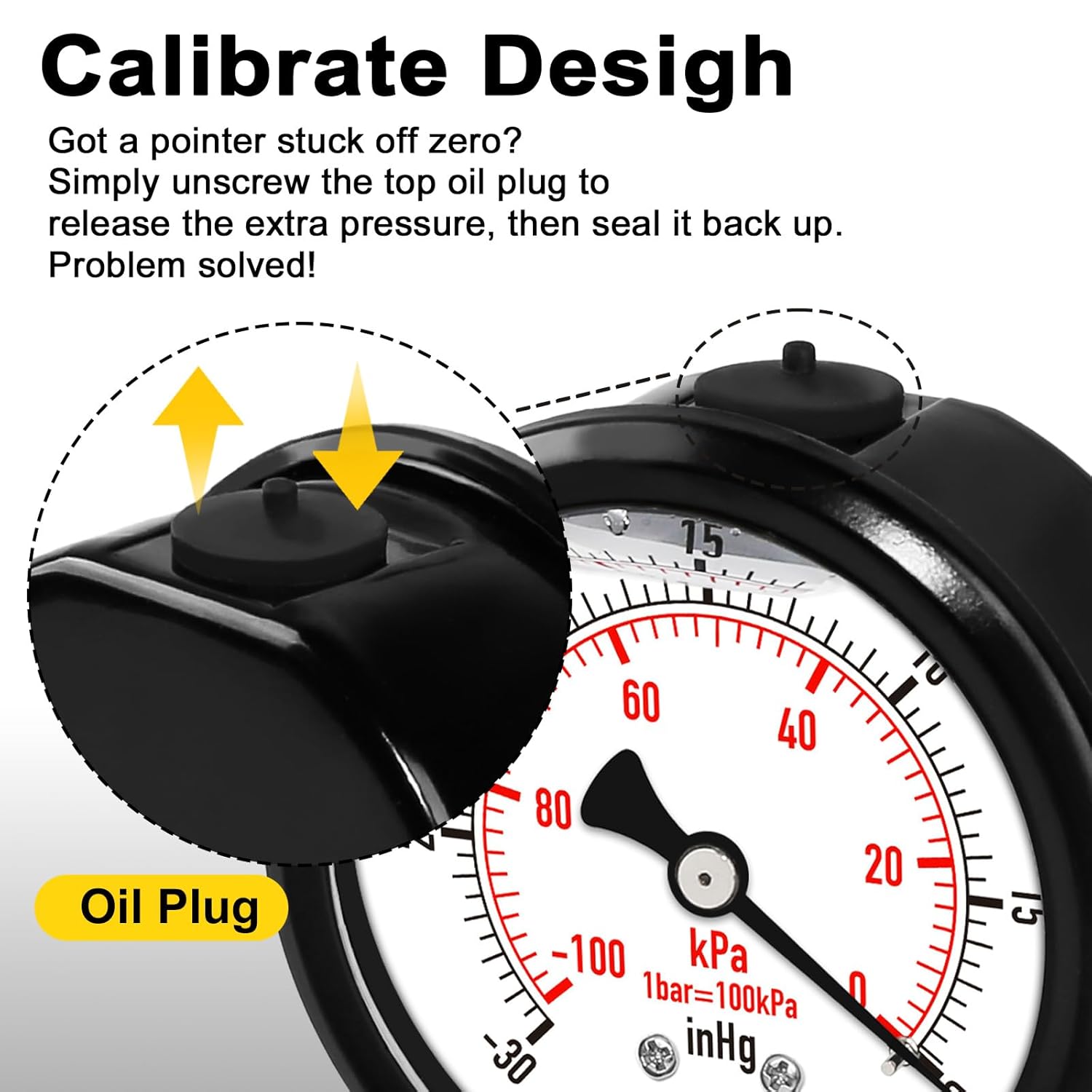- 【SHOCKPROOF DESIGN】:The glycerin filling inside the vacuum pressure gauge helps to dampen needle vibrations caused by pulsations or pressure spikes, providing more precise and consistent readings. This feature enhances the gauge's ability to resist shocks and vibrations, ensuring stable and accurate readings even in turbulent settings.