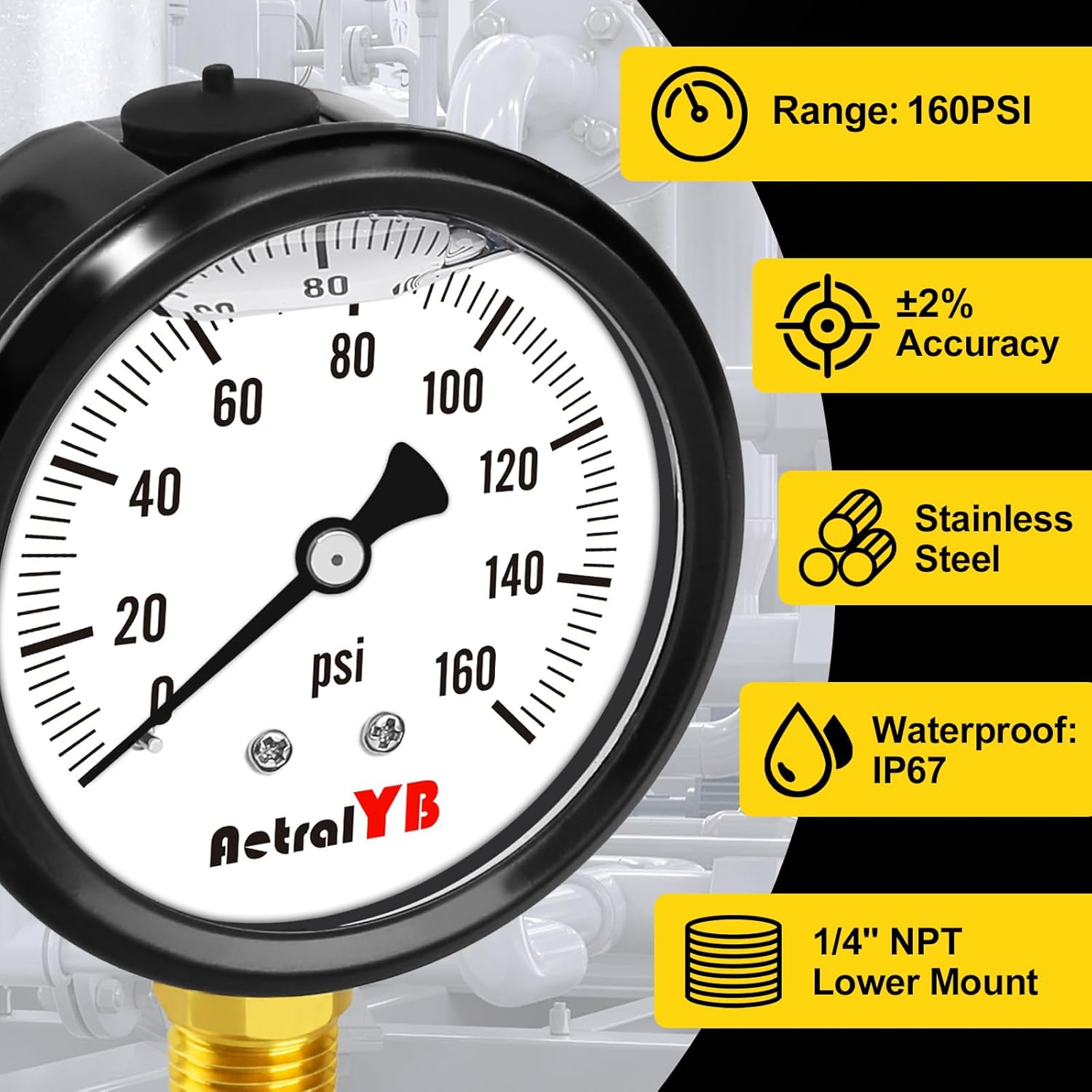 0-160 Psi Pressure Gauge,Stainless Steel Case,Glycerin Liquid Filled, 2.5" Dial Size, 1/4" NPT Lower Mount, IP67 Waterproof,for Water Pump, Air Compressor, Well Pump, RV Regulator
