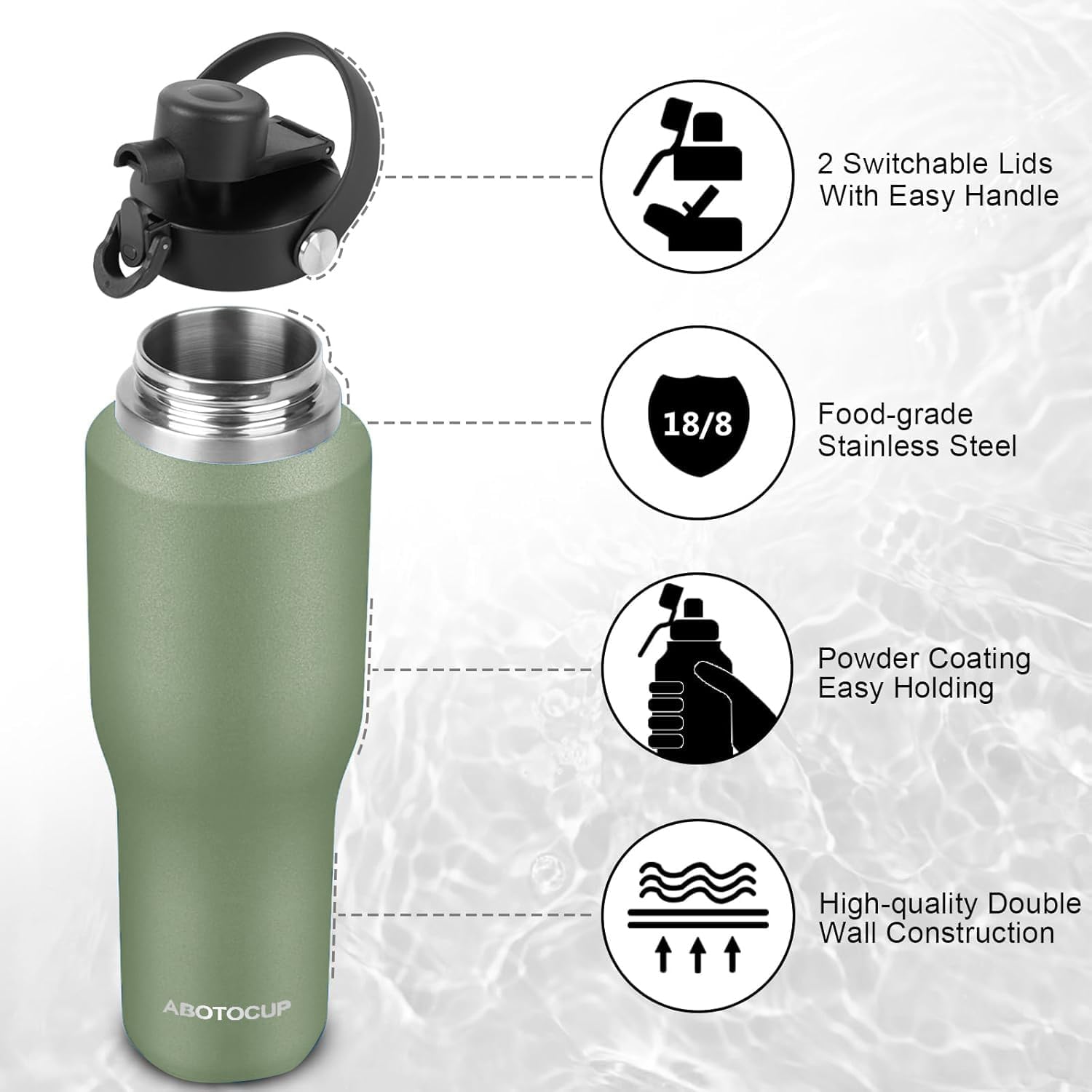 - 【2 LEAK-PROOF LIDS】ABOTOCUP insulated water bottle provide a different drinking experience with two lids that are fully leak-proof and designed for effortless drinking. Easy to use one-handed or hands-free drinking even when you're busy. Perfect for all indoor and outdoor activities.
