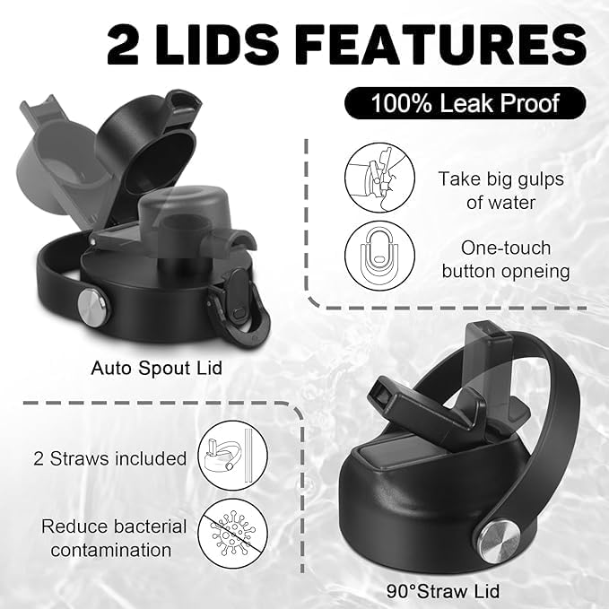 - 【2 LEAK-PROOF LIDS】ABOTOCUP 32 oz insulated water bottle provide a different drinking experience with two lids that are fully leak-proof and designed for effortless drinking. Water bottle stainless steel easy to use one-handed or hands-free drinking even when you're busy. Gym water bottle stainless steel perfect for all indoor and outdoor activities.