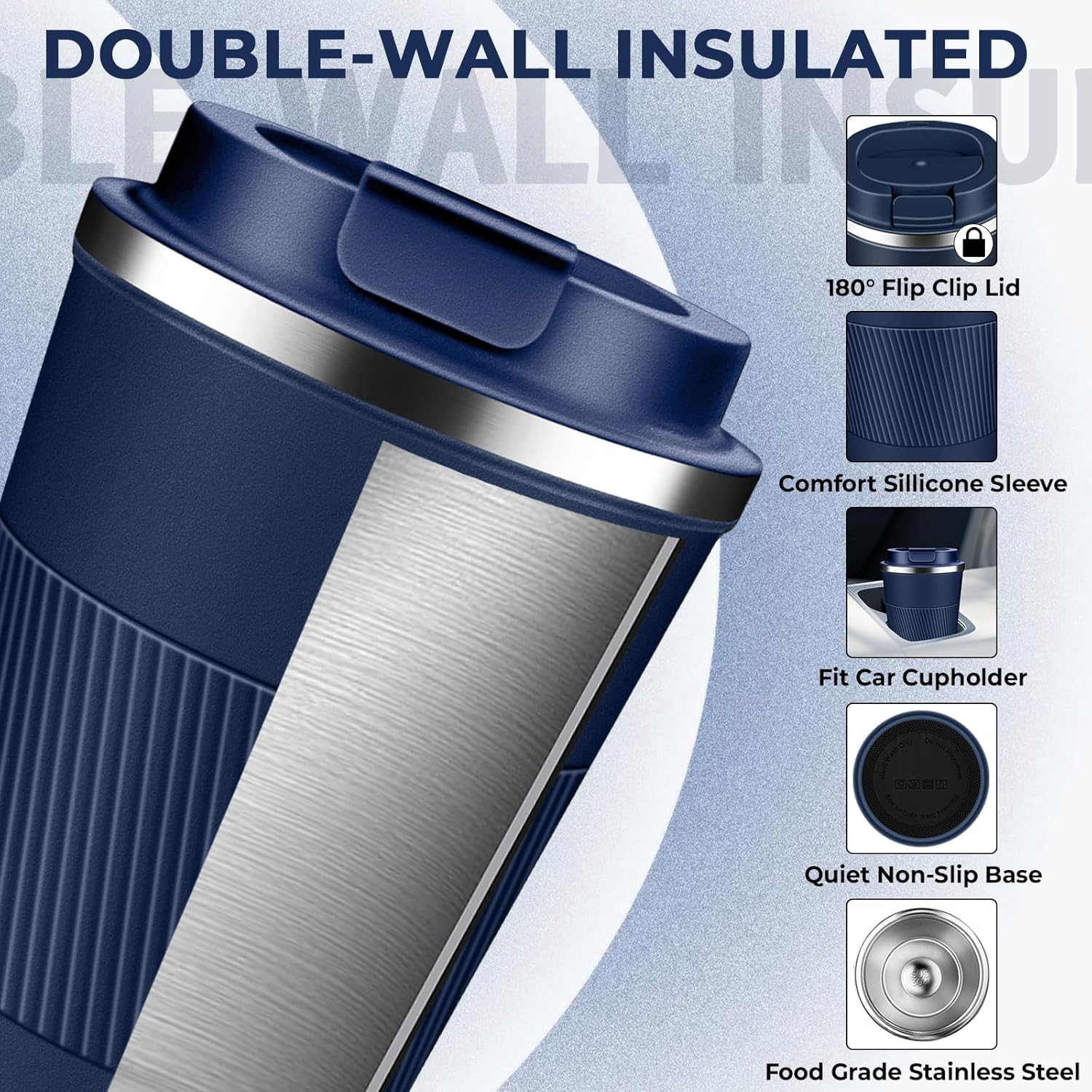 - Leak-Proof & Easy to Clean: The travel coffee mug features a secure screw lid with a sealing silicone strip and a convenient one-hand 180° flip-top snap for splash-free sipping, the wide mouth allows for easy filling and cleaning, comfort-grip silicone sleeve ensures a non-slip, secure hold, quiet base prevents slip