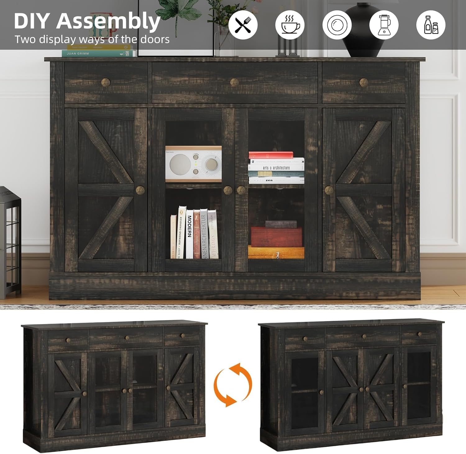 - Large Storage Space: Kitchen coffee bar cabinet with 55" wide top holds your frequently used items, three drawers keep small items organized; two glass-door cabinets and a large center cabinet provide both display and hiding space for different needs
