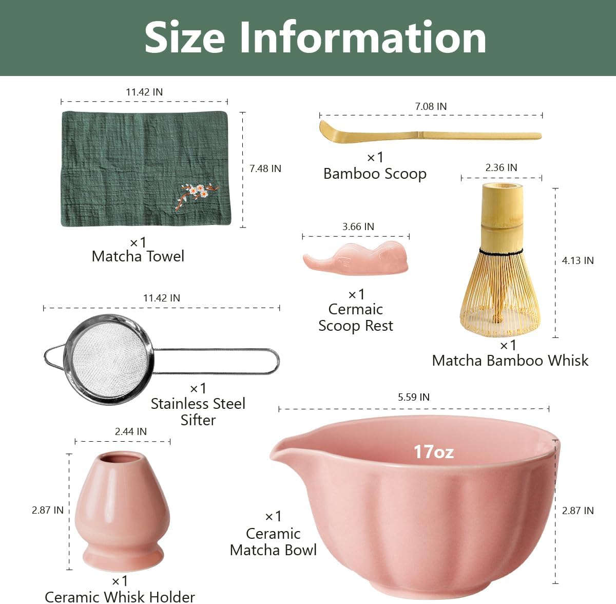 - Complete Matcha Set:All-in-One matcha bowl and whisk set with 1* Bamboo Matcha Whisk, 1* Bamboo Scoop, 1* Dog Shape Design Scoop Rest, 1* Stainless Steel Sifter, 1* 500 ml/17 oz Ceramic Matcha Bowl (Chawan), 1* Whisk Holder, 1* Unique Tea Towel and 1* Hand Book. Thoughtful matcha gift set for matcha beginners & matcha ceremony lovers.