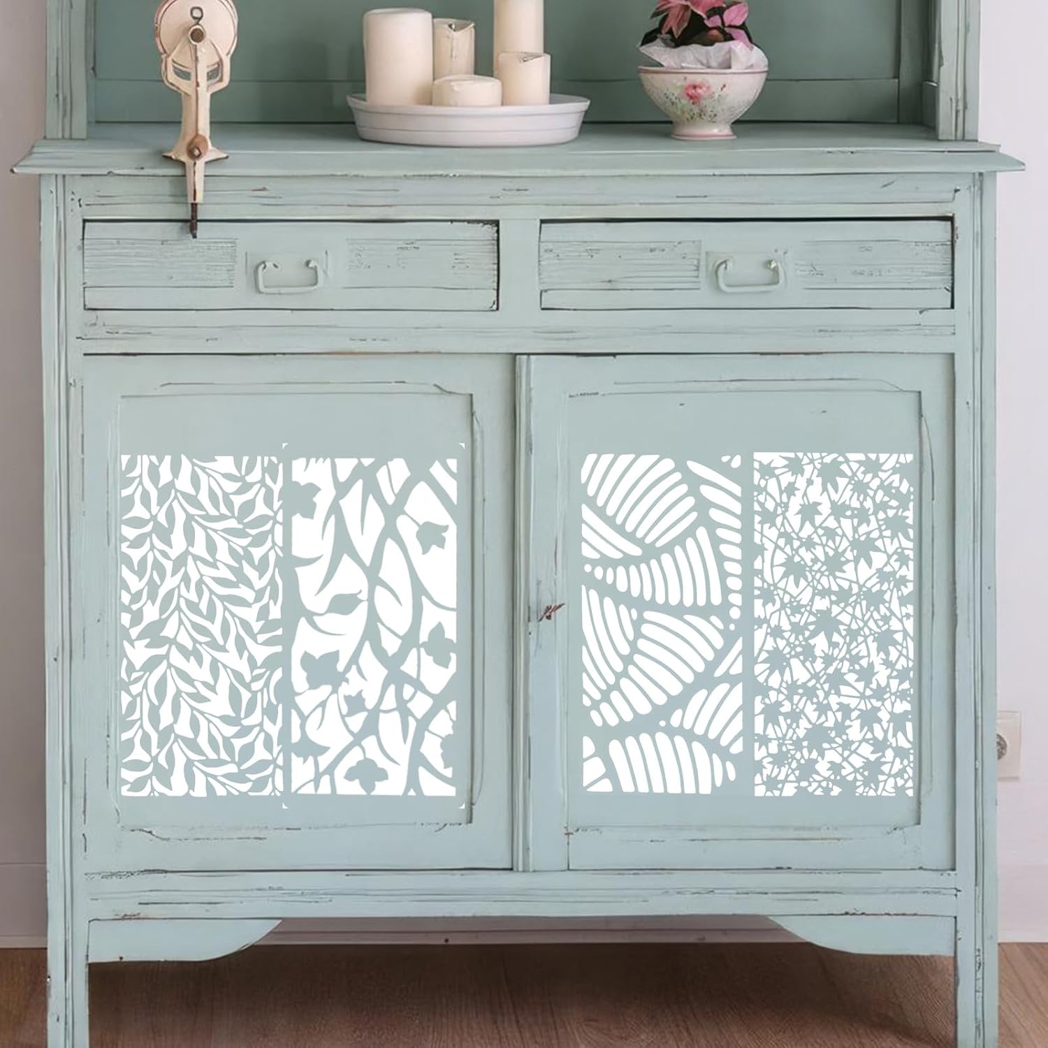 - 【Wide Application】: Perfect for cabinet dresser table border cake door mat decorating, these stencils can be used on a variety of surfaces, including wall, paper, wood, canvas, fabric, glass, floor, metal and more you like, and suitable for decorating murals, gift cards, scrapbooks, photo albums, envelopes, clothes, doors, window, desks, floors, wooden tags, shirt, cookie, cake and more. They are ideal for DIY enthusiasts looking to add a personal touch to their home decor.