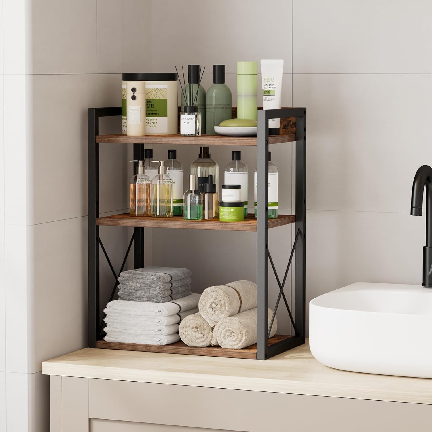 3-Tier Kitchen Spice Rack Organizer for Countertop, Coffee Counter Shelf, Mug Shelf, Bathroom Counter Organizer, Makeup Organizer, Rustic Brown and Black