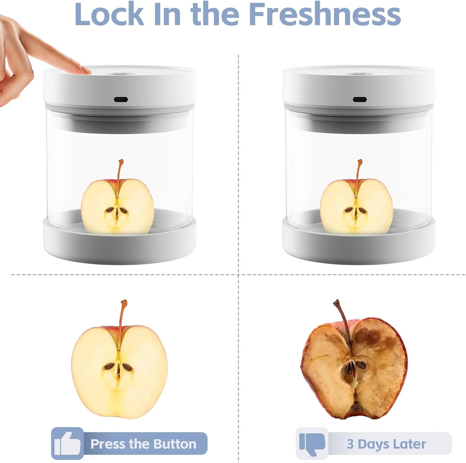 - PLEASE NOTE: When you press the start button of the vacuum coffee canister, the indicator light blue means the airtight food storage containers is in working condition, it will keep the vacuum automatically; red means the machine is off, you can choose to turn it off when you don't need to use it. When you open the lid, the coffee bean storage canister will start the vacuum program after 10-15 seconds of detecting air.