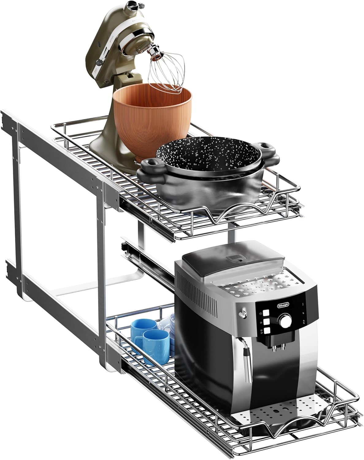 - 2-TIER PULL OUT CABINET ORGANIZER: Maximize kitchen space with dual pull-out shelves that slide independently for full-extension access. Easily organize cookware, pantry items, or cleaning supplies in hard-to-reach cabinets.
