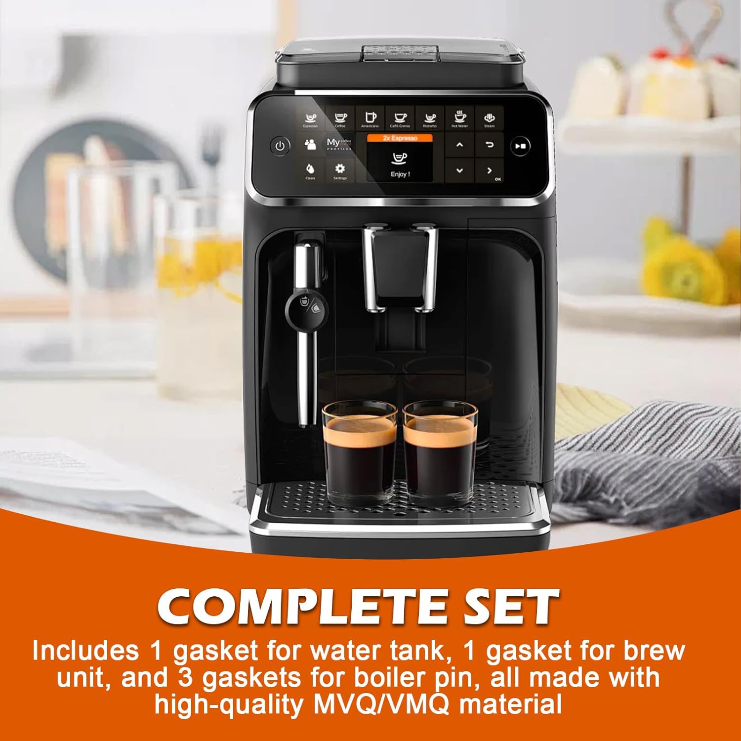 - COMPLETE SET: Includes 1 gasket for water tank, 1 gasket for brew unit, and 3 gaskets for boiler pin, all made with high-quality MVQ/VMQ material
