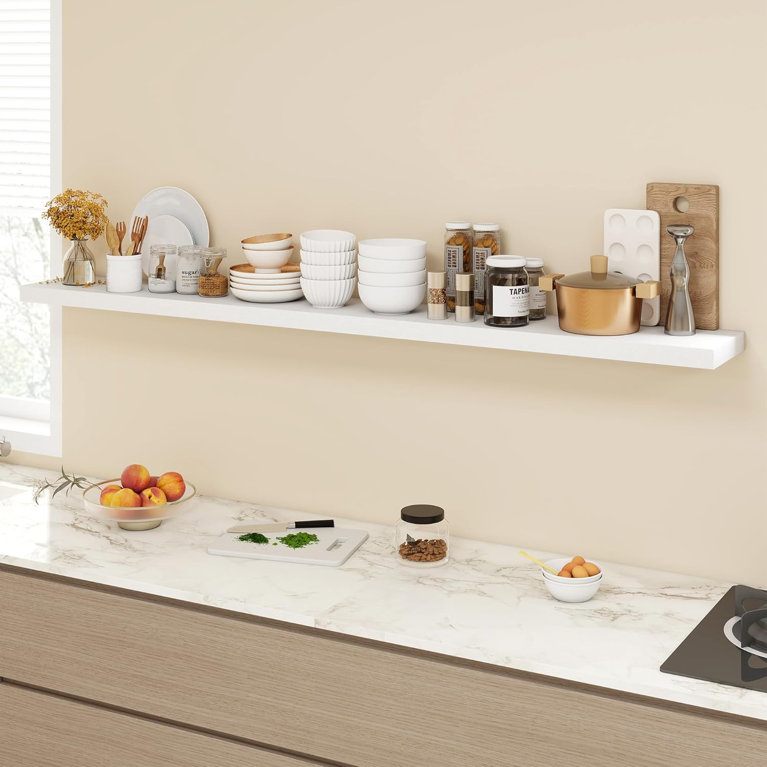 - [RUSTIC CHARM WITH CONTEMPORARY TOUCH]: These hollow-core 72 inch floating shelves seamlessly merge farmhouse elegance with modern aesthetics. Made from premium engineered wood, their rustic wood grain brings warmth and texture to any room. Arrange them side-by-side, staggered, or in a corner for a streamlined look that enhances both traditional and contemporary interiors.