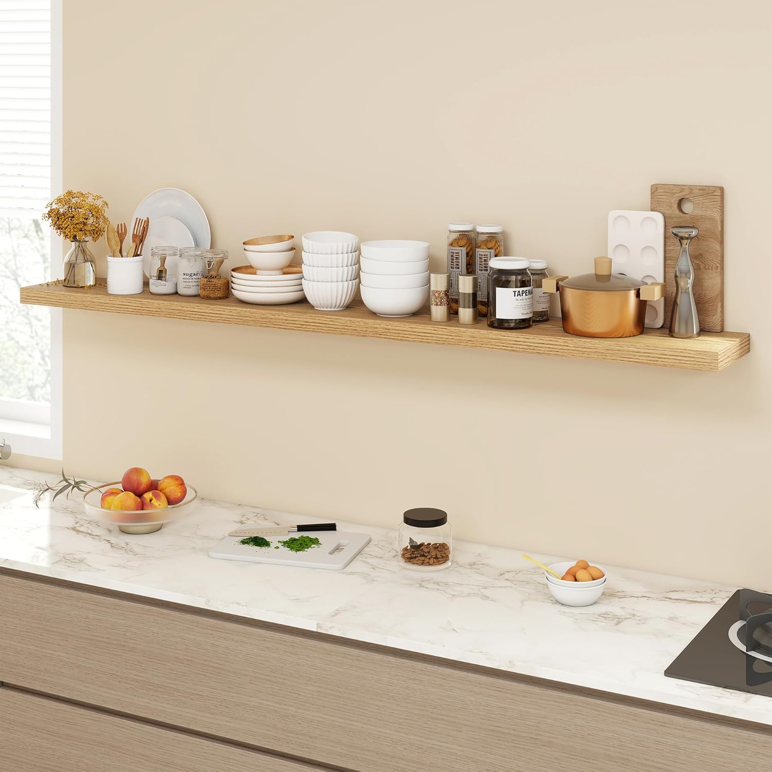 - [RUSTIC CHARM WITH CONTEMPORARY TOUCH]: These hollow-core 72 inch floating shelves seamlessly merge farmhouse elegance with modern aesthetics. Made from premium engineered wood, their rustic wood grain brings warmth and texture to any room. Arrange them side-by-side, staggered, or in a corner for a streamlined look that enhances both traditional and contemporary interiors.