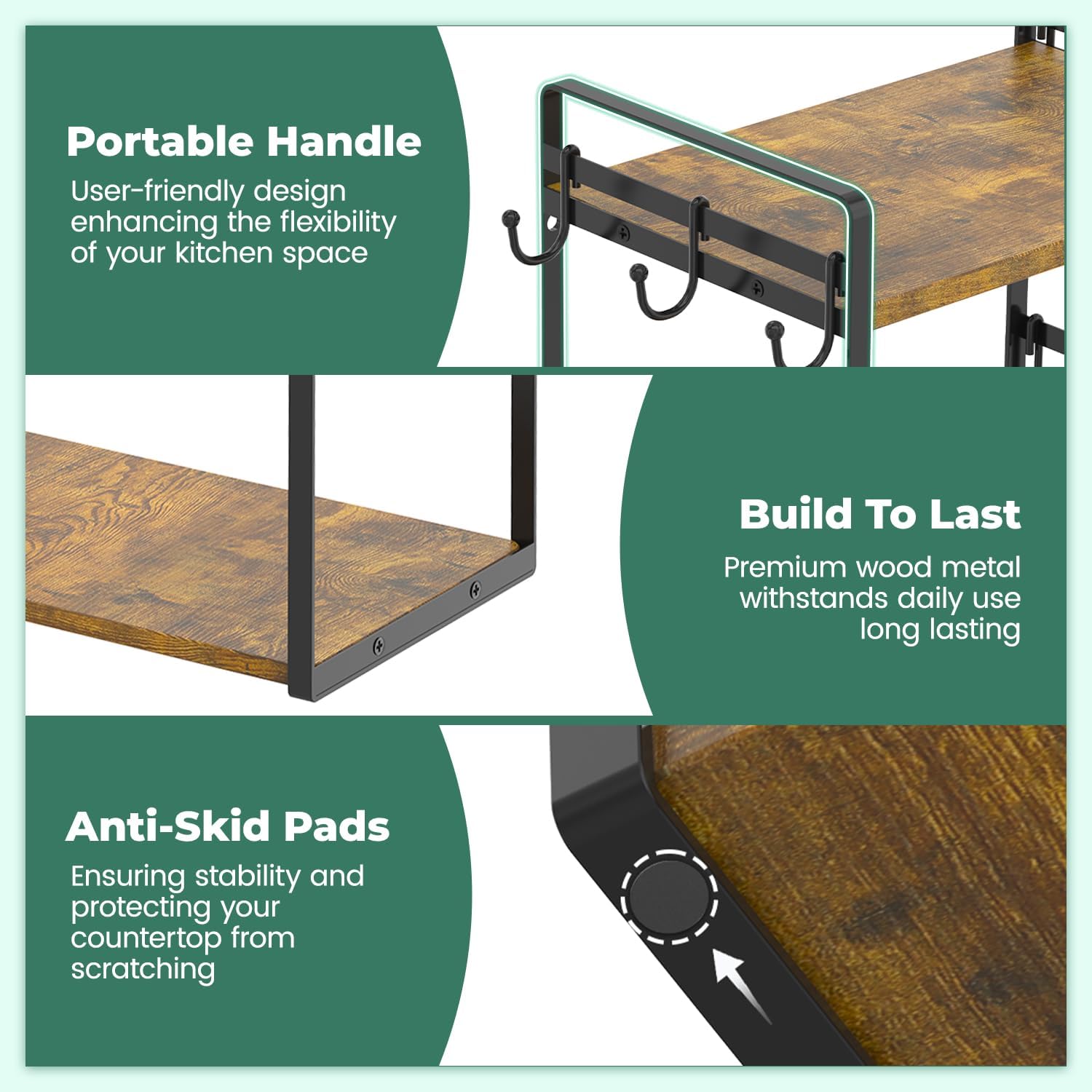 - Ample Dual-Tier Storage: Elevate your coffee experience with EsLuker.ly's 2-tier coffee mug holder for kitchen. With two shelves and 12 hooks, it offers ample space for coffee essentials, perfect for home or office countertops, meeting the storage needs of any coffee enthusiast